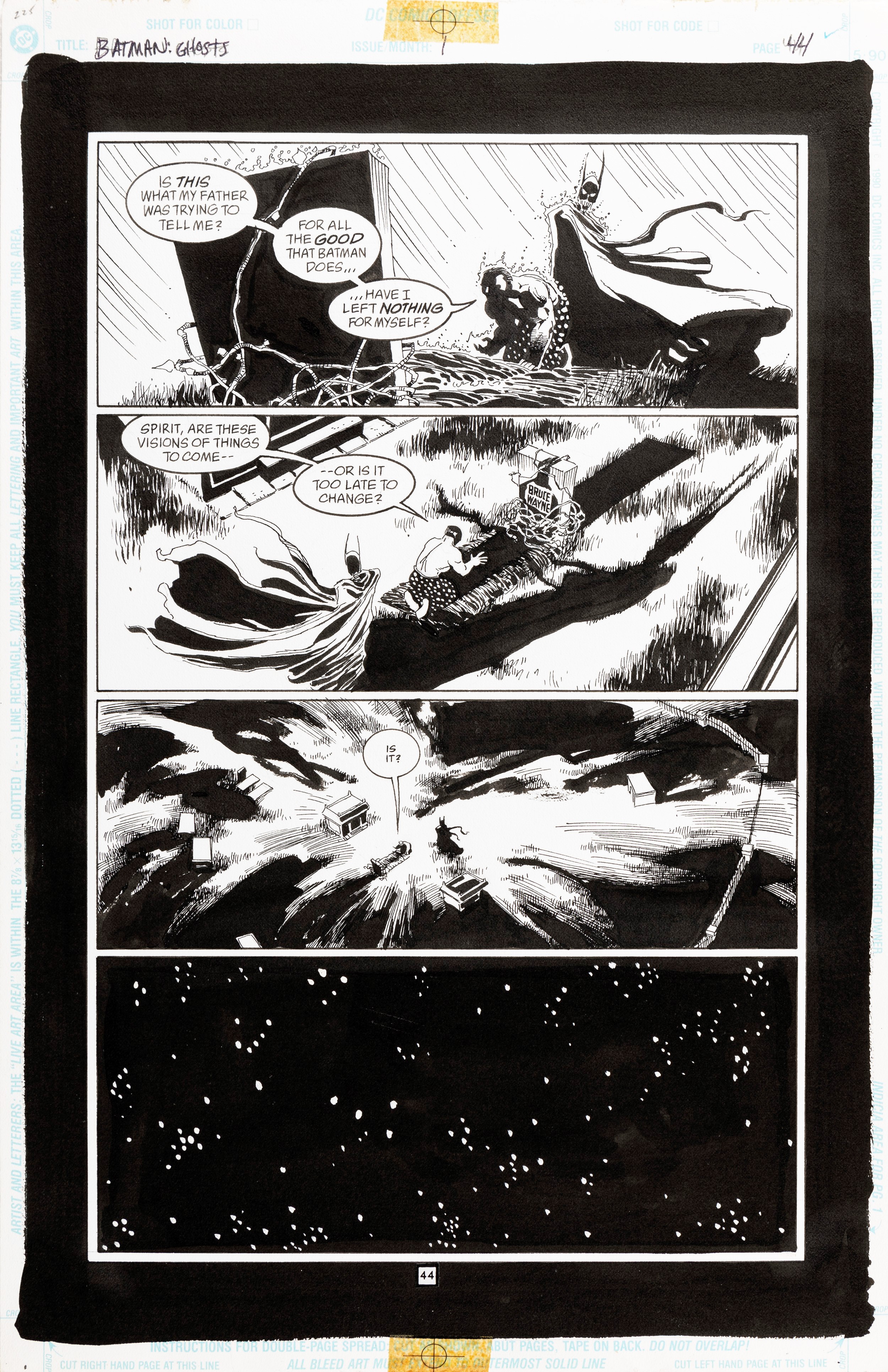 matita e china su cartoncino DC, 28 x 43 cm 1995 Tavola originale realizzata da Sale per Batman Ghosts: A Legends of the Dark Knight Halloween Special edita a pag. 44 dalla DC nel 1995. Una storia leggendaria tra le più amate dai fan del cavaliere oscuro, Loeb e Sale mettono in scena una trama dickensiana in cui Bruce Wayne durante la notte di Halloween viene visitato da tre spiriti che gli mostreranno il suo passato, presente e futuro. In questa pagina vediamo l'epilogo di questa lunga notte, l'ultimo spirito è un uomo incappucciato che mostra a Bruce la sua bara rivelandogli quanti pochi sentiranno la sua mancanza se continuerà ad allontanare tutti le persone care da sè; l'uomo incappucciato è lo stesso Bruce con il costume da Batman, ma le sue sembianze sono quelle di un orrido scheletro. Di grande rarità.