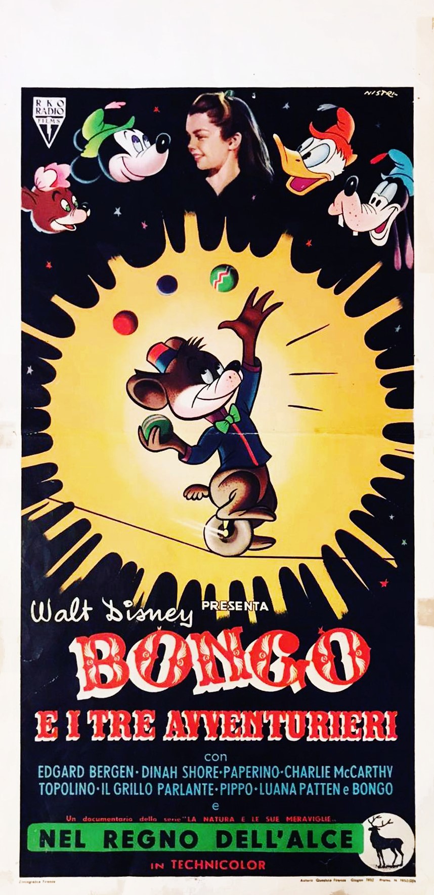 1952 Bozzetto preliminare realizzato da Giuliano Nistri per la locandina ufficiale del classico Disney Bongo e i tre avventurieri, prodotto dalla Walt Disney Productions nel 1947. Firmato.