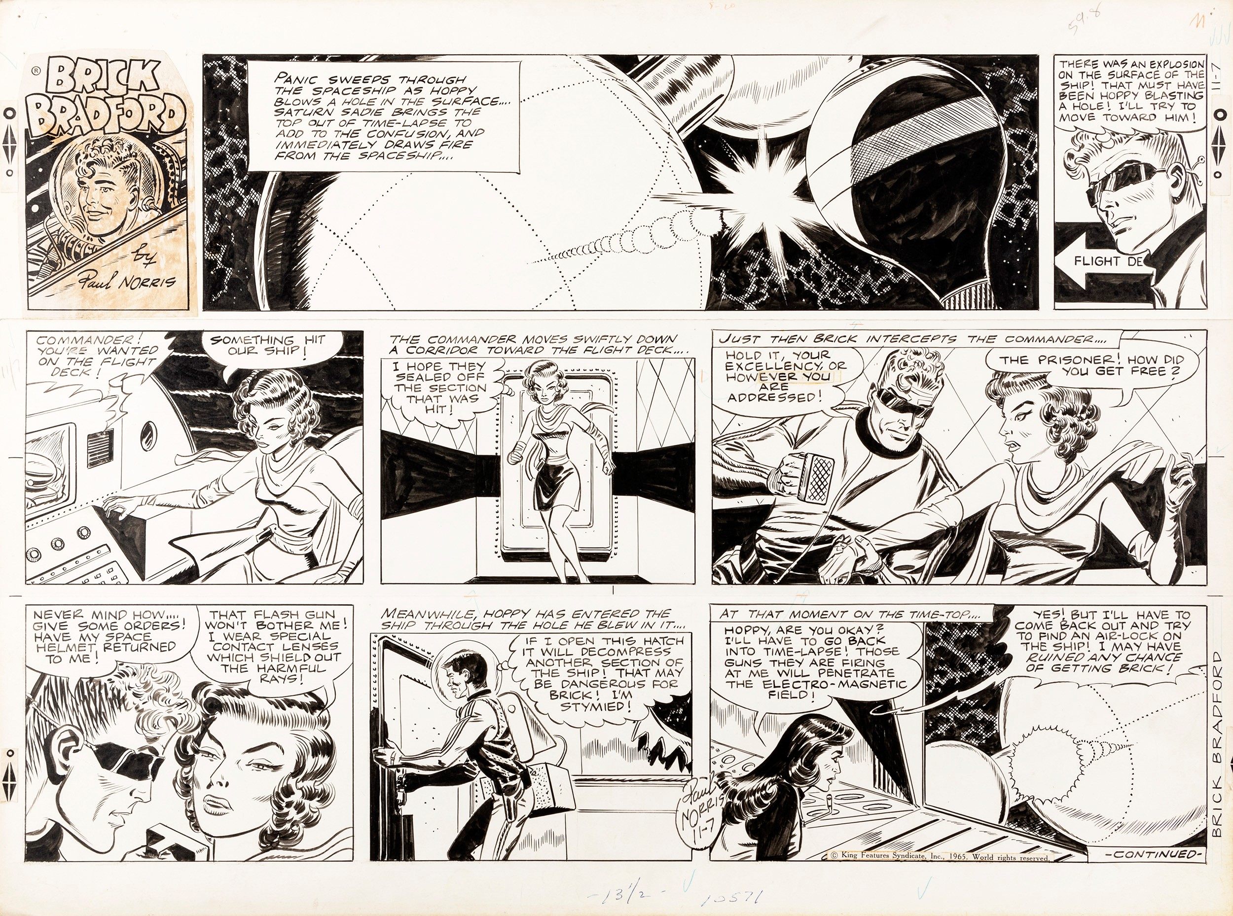 1965 Tavola domenicale del 07/11/1965 per Brick Bradford. Due pieghe orizzontali. Firmata e datata.