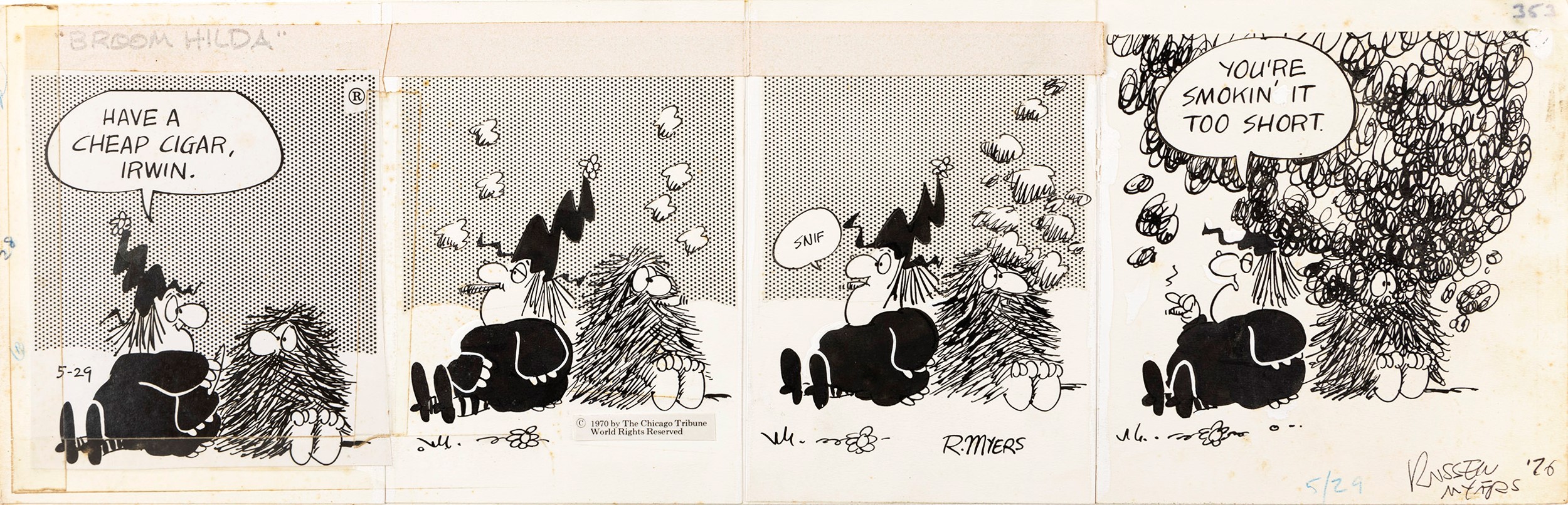 matita, china e retino su cartoncino rimontato, 56 x 18 cm 1970 Striscia giornaliera del 29/05/1970 per Broom Hilda. Nata solo 40 giorni prima (il 19 Aprile del 1970) dal genio di Myers, Broom Hilda è una striscia che sfrutta in maniera arguta e originale gli archetipi delle fiabe e del fantasy in chiave umoristica, avendo come protagonista una strega di 1500 anni sempre alla ricerca di uno spasimante, ma il fatto di non rispondere esteticamente ai canoni di bellezza classici richiesti sembra non scalfirla affatto. Prima vignetta in fotocopia. Firmata e datata.