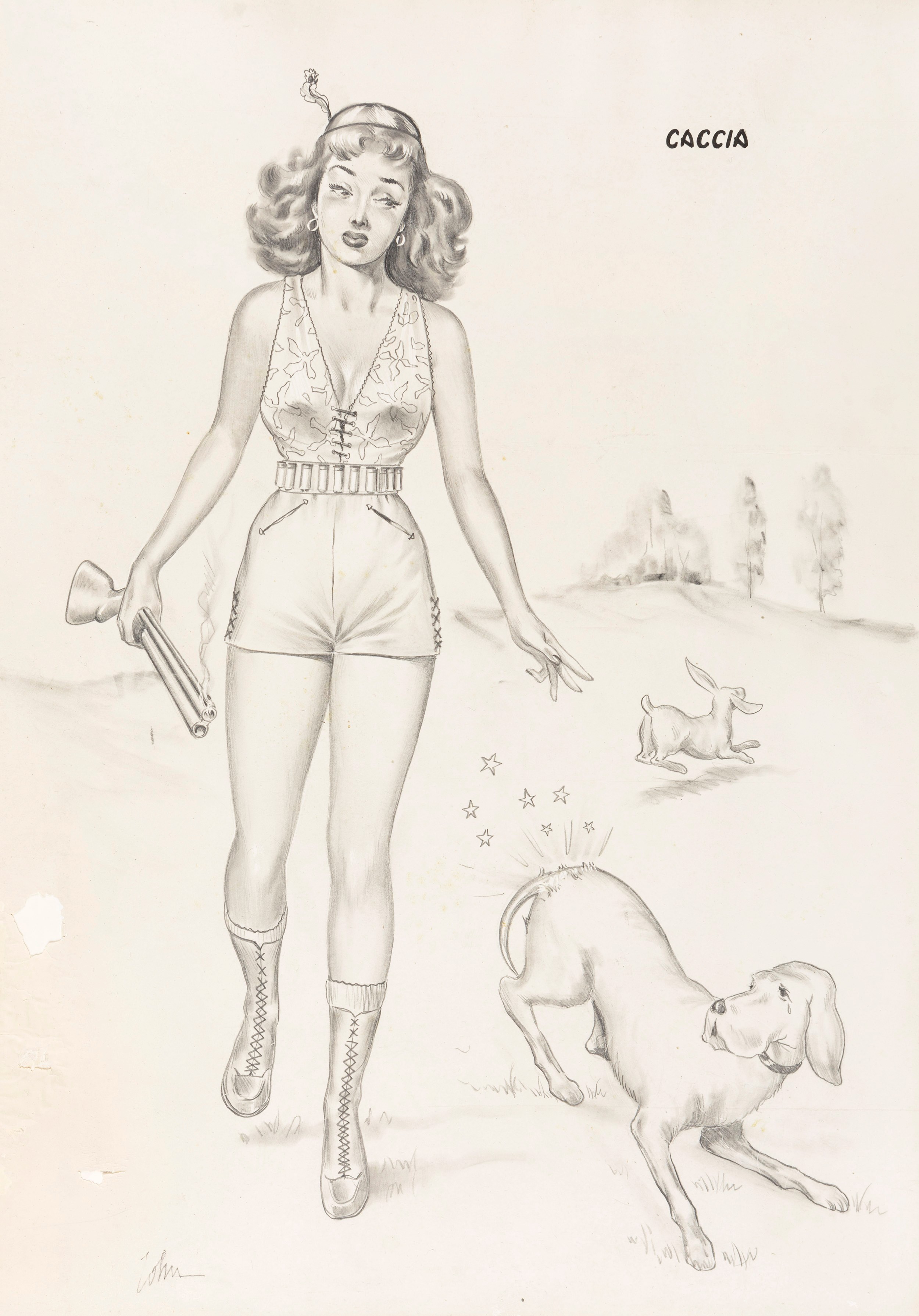 matita su carta applicata a cartoncino, 28 x 40 cm anni ’30 Illustrazione originale realizzata da Guida all’interno di una serie di figurini destinati al mercato di abbigliamento sportivo femminile. Due mancanze al margine inferiore sinistro. Firmata e titolata.