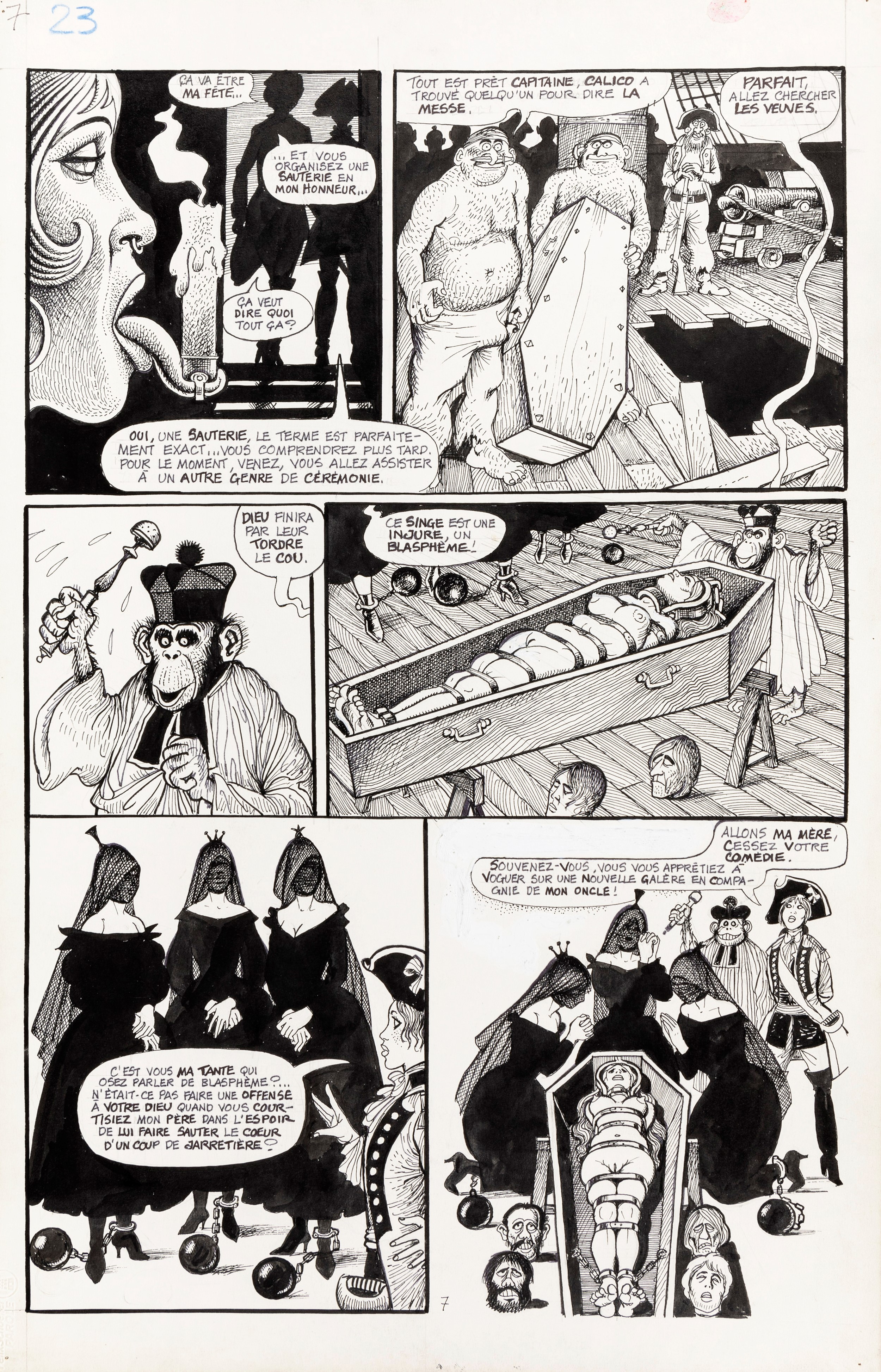 matita e china su cartone, 32 x 50 cm 1978 Tavola originale realizzata da Pichard per il secondo volume di Caroline Choléra intitolato Donnez-moi mon copain quotidien pag. 7, edito per la prima volta in Francia da Les Éditions du Fromage nel 1978. Fori di affissione agli angoli.