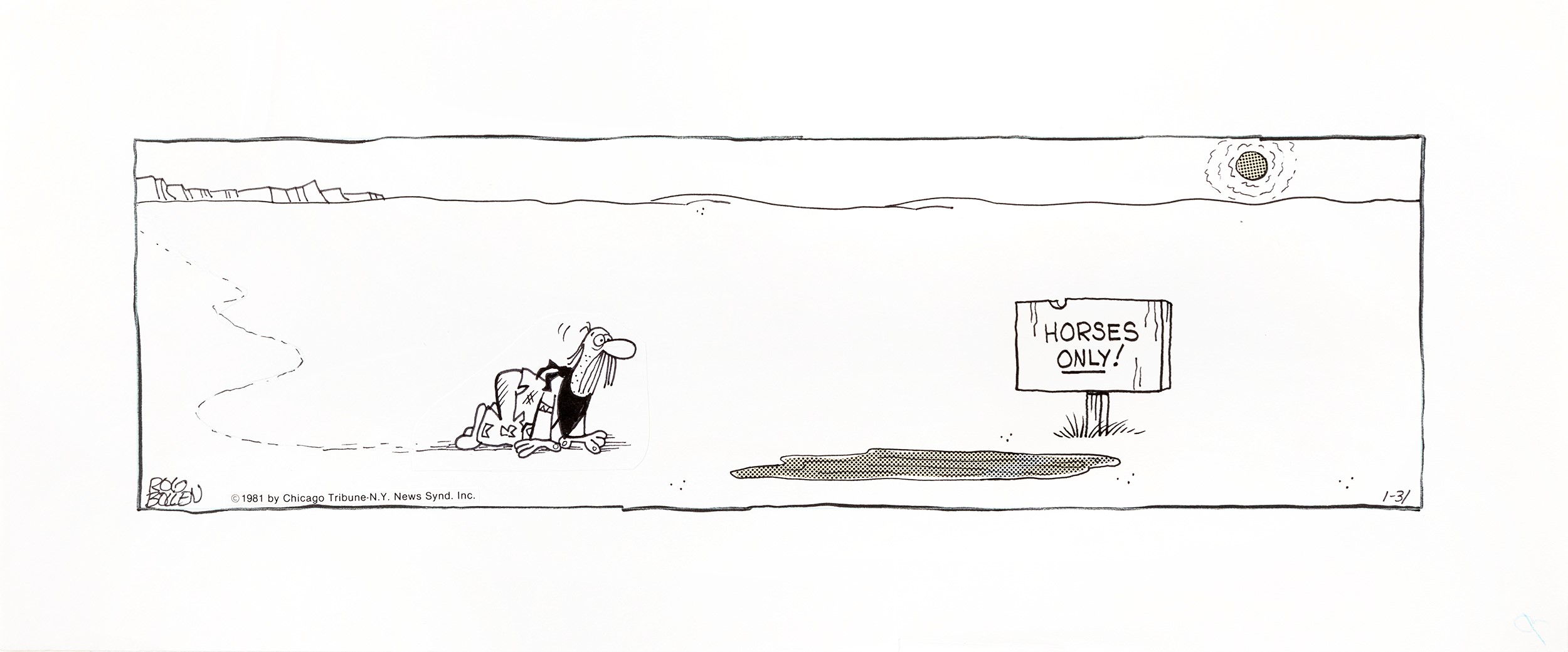 matita, china e retino su carta, 42 x 18 cm 1981 Striscia giornaliera del 31/01/1981 per Catfish. Strip nata nel 1973 che narra le gesta di Catfish, quella che dovrebbe essere la più abile guida del selvaggio west, di fatto capace di perdersi in un bicchier d'acqua. Firmata e datata.