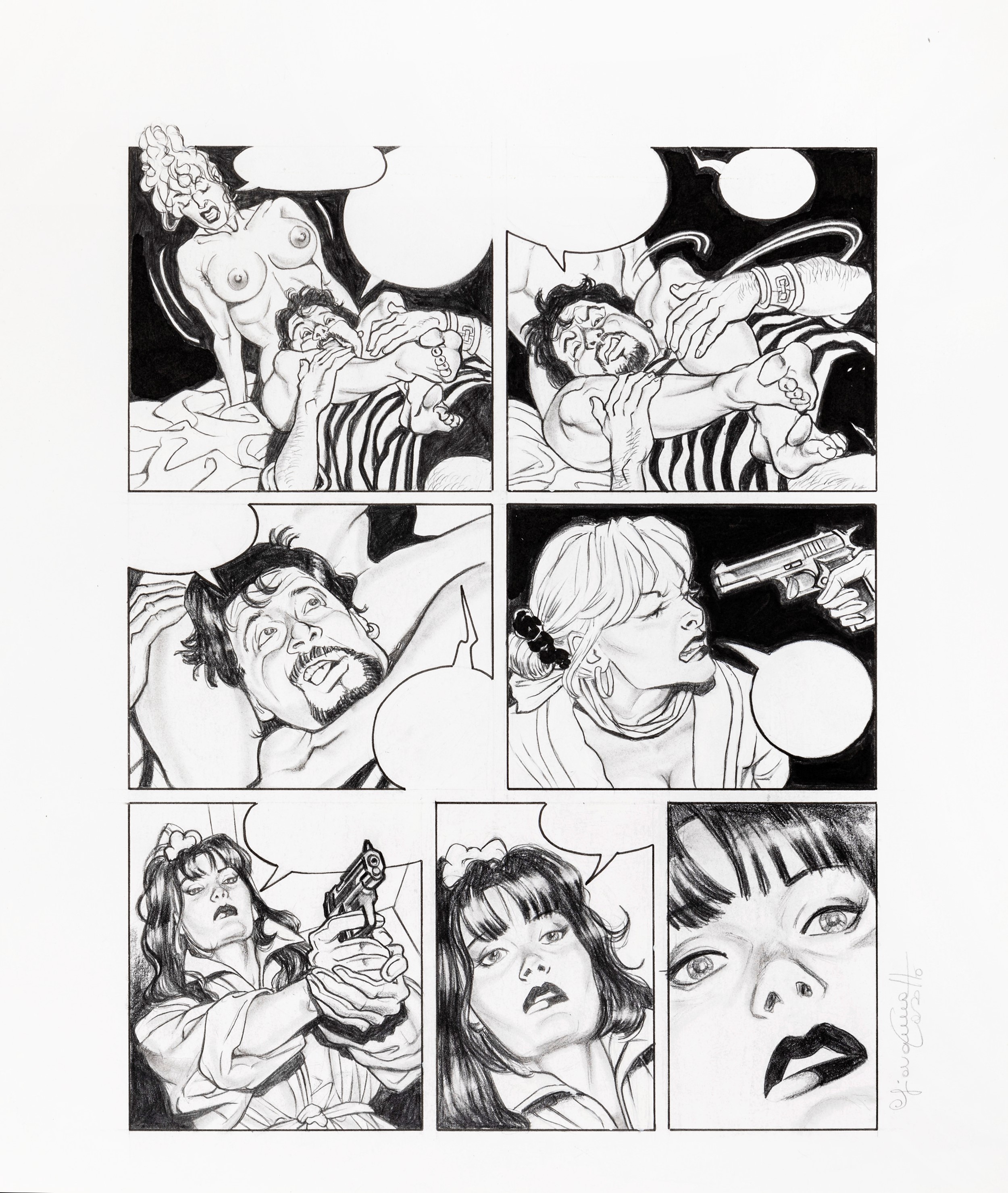 tecnica mista su cartoncino, 25 x 36,5 cm anni ’90 Tavola originale realizzata dalla Casotto per la storia erotica Cattive attitudini, pubblicata per la prima volta sulla rivista Blue negli anni ’90. Sceneggiatura di Pasquale Petrolo (Lillo), rappresentato in questa tavola. Firmata al fronte e firmata e titolata al retro.