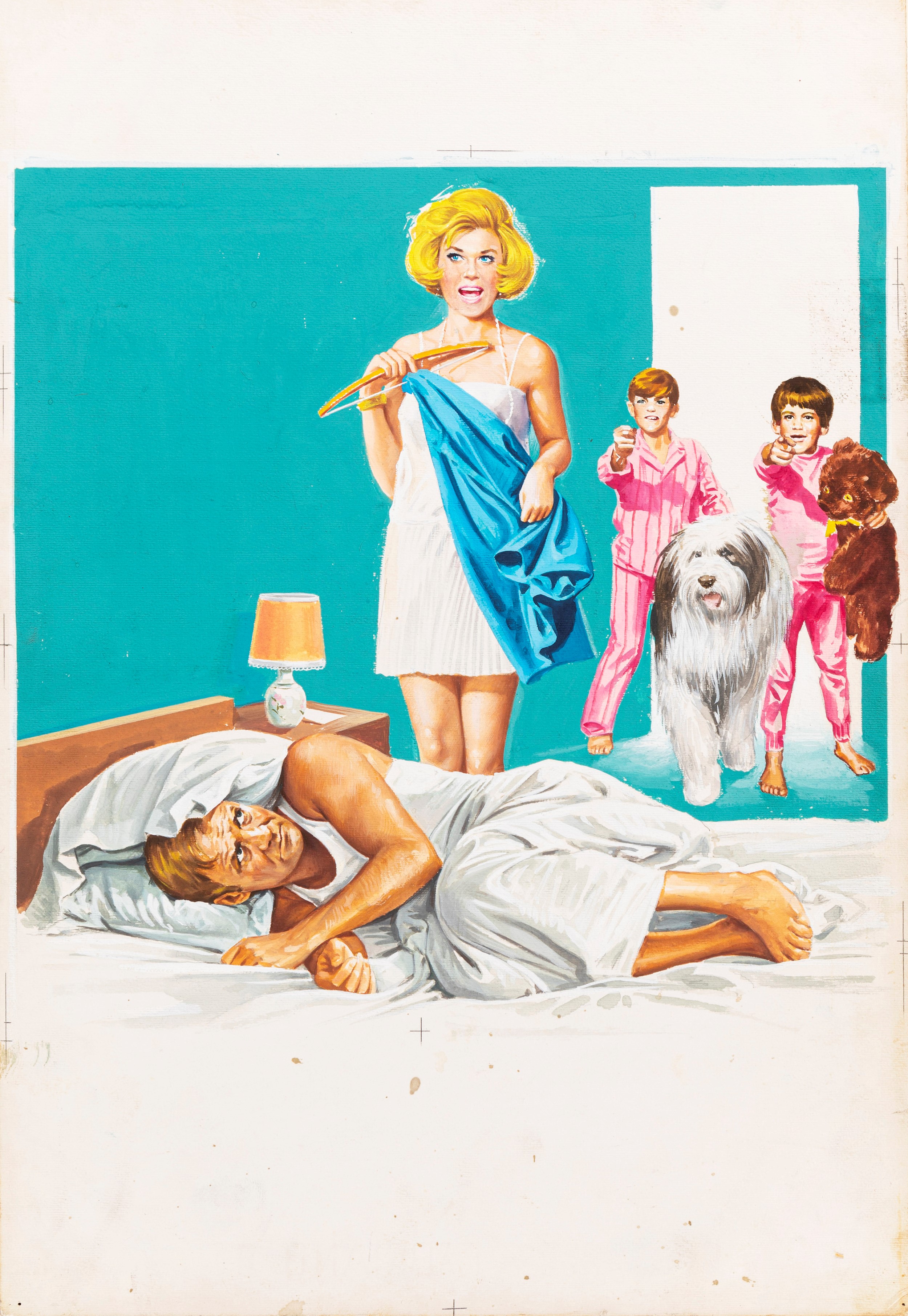 tempera su cartone, 33 x 48 cm 1968 Bozzetto originale per la locandina ufficiale del film C'è un uomo nel letto di mamma, diretto da Howard Morris con Doris Day, Brian Keith e Barbara Hershey nel 1968. Fori di affissione agli angoli.