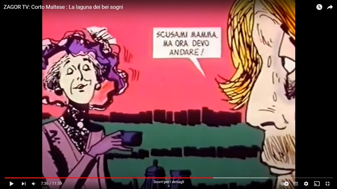 tempera su rodovetro, 23 x 15 cm 1977 Cel originale (tre fogli) realizzata dallo Studio Bignardi per la sequenza n. 25 de Corto Maltese e la laguna dei bei sogni, episodio della serie su Corto Maltese che rinnova la collaborazione di Pratt con lo studio di animazione modenese, episodio trasmesso per la prima volta nella trasmissione SuperGulp! nel 1977.