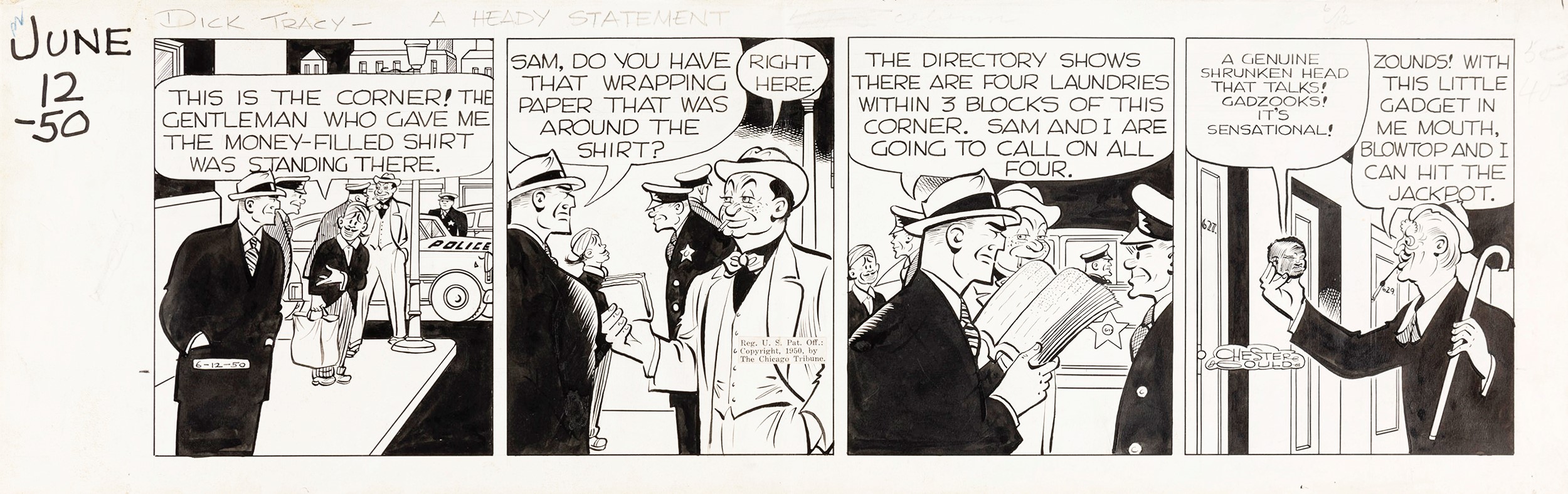matita e china su cartoncino, 58,5 x 18,5 cm 1950 Striscia giornaliera del 06/12/1950 per Dick Tracy. Apparsa per la prima volta nel 1931, questa striscia divenne rapidamente un´icona della cultura popolare americana e contribú a stabilire un nuovo standard per i crime comics. Piega verticale al centro. Firmata e datata.