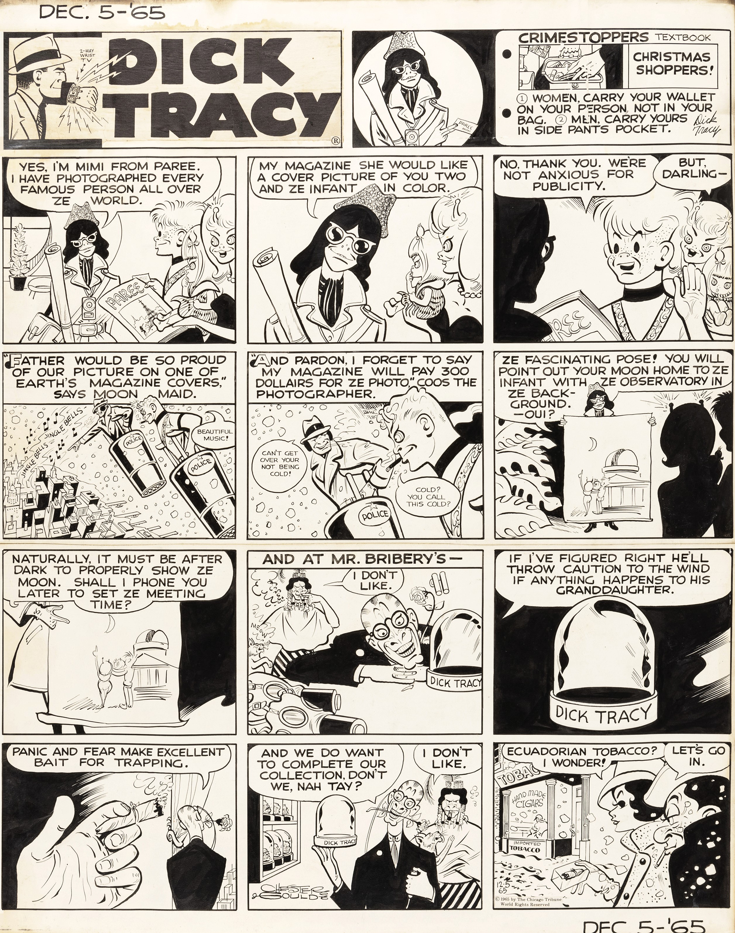 1965 Tavola domenicale del 05/12/1965 per Dick Tracy. Su due pannelli. Lieve piega al margine destro. Firmata e datata.