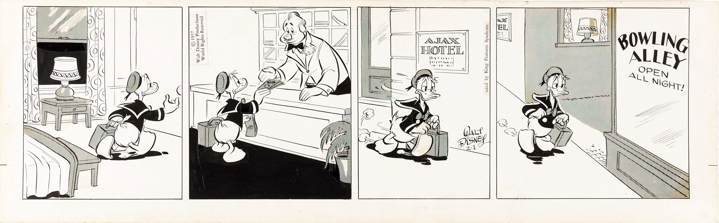 matita, china e retino su cartoncino, 53 x 16,5 cm 1957 Striscia giornaliera del 01/02/1957 per Donald Duck. Taliaferro è considerato uno dei più illustri genitori del personaggio di Paperino, grazie a lui il giovane papero diventa una delle star della famiglia Disney. Firmata Walt Disney e datata.