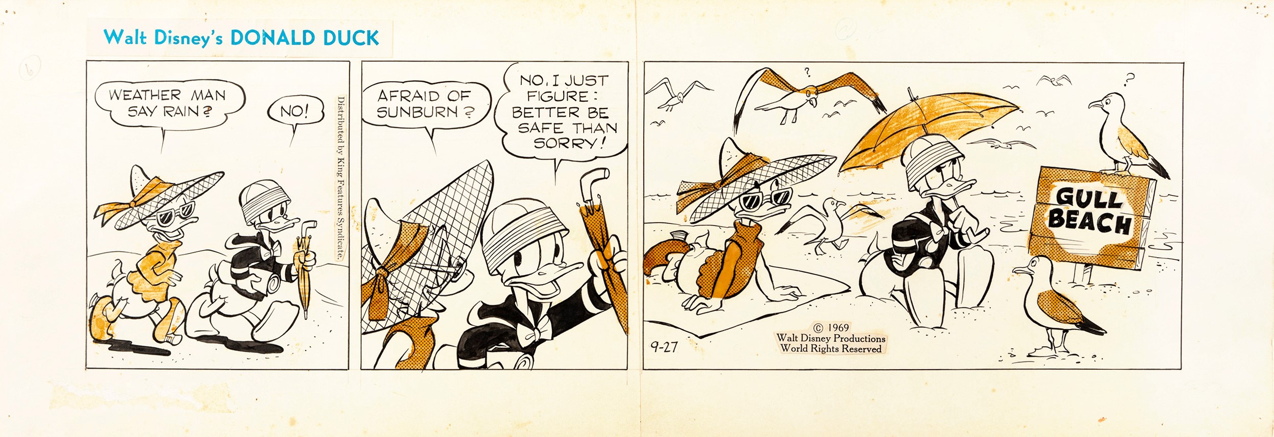 1969 Striscia giornaliera del 27/09/1969 per Donald Duck. Fori di affissione agli angoli e piega verticale al centro.