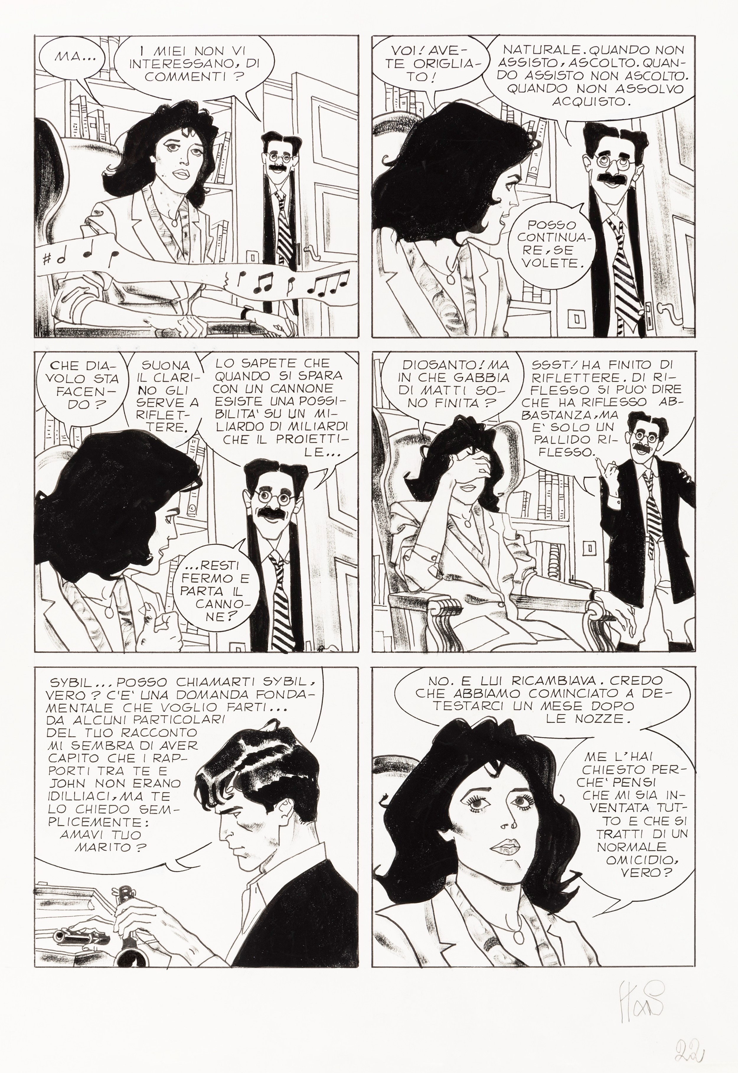 matita e china su cartoncino, 35 x 50 cm 1986 Tavola originale realizzata da Stano per LŽalba dei morti viventi, edita su Dylan Dog n. 1 a pag. 22 dalla Bonelli nel 1986. Una pagina iconica in cui per la prima volta veniamo travolti dalla surreale comicità di Groucho, e in cui compaiono la bella Sybil e un primo piano del nostro Dylan con il clarinetto in mano. Firmata.