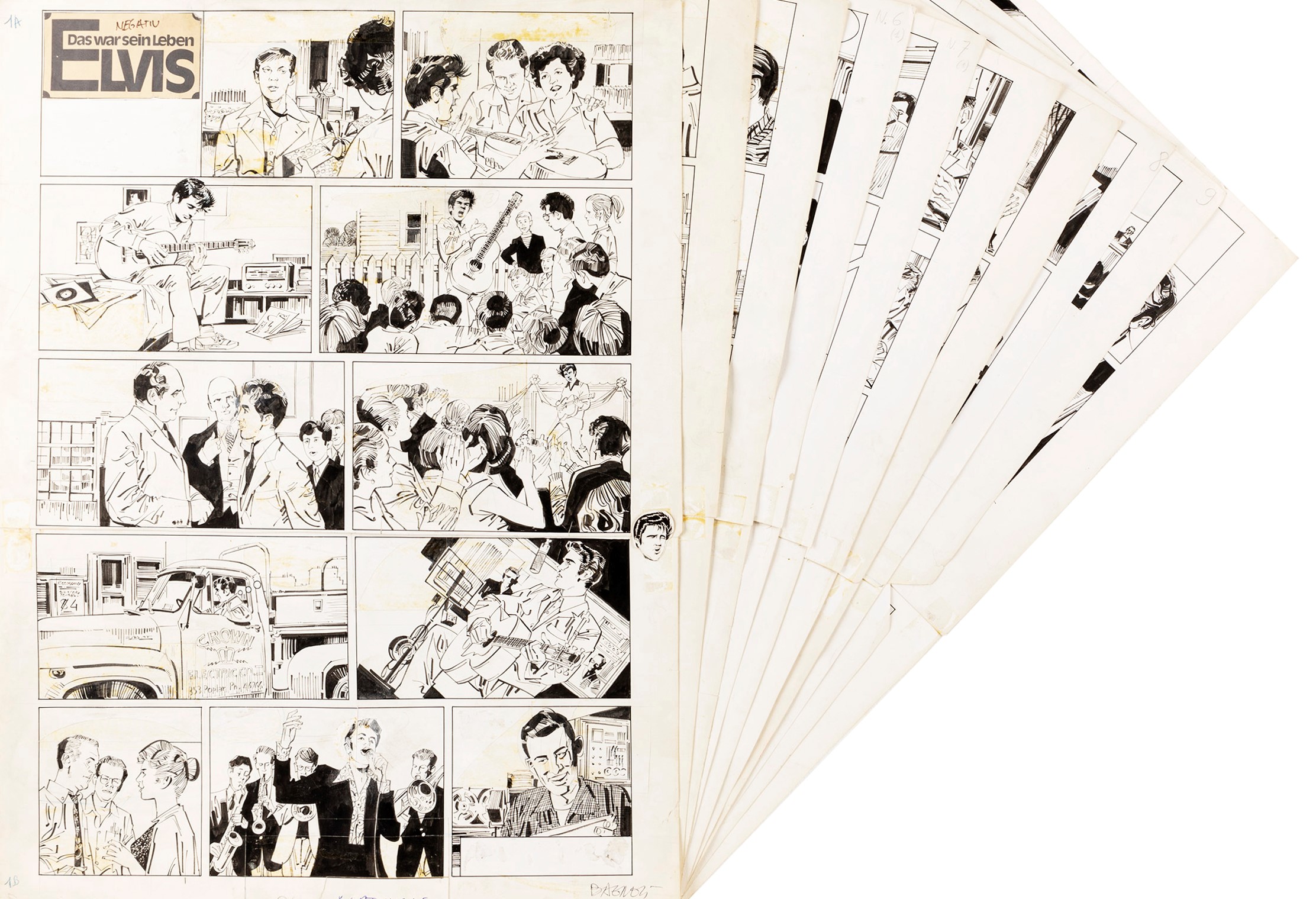 matita e china su cartoncino, 46 x 62 cm ciascuno Storia competa composta da 10 tavole originali realizzate da Bagnoli per Elvis edita per la prima volta in Germania negli anni '70 e successivamente in Italia sulle pagine di Corrier Boy nel 1978. Su due pannelli. Piccoli strappi. Firmata in ogni pagina
