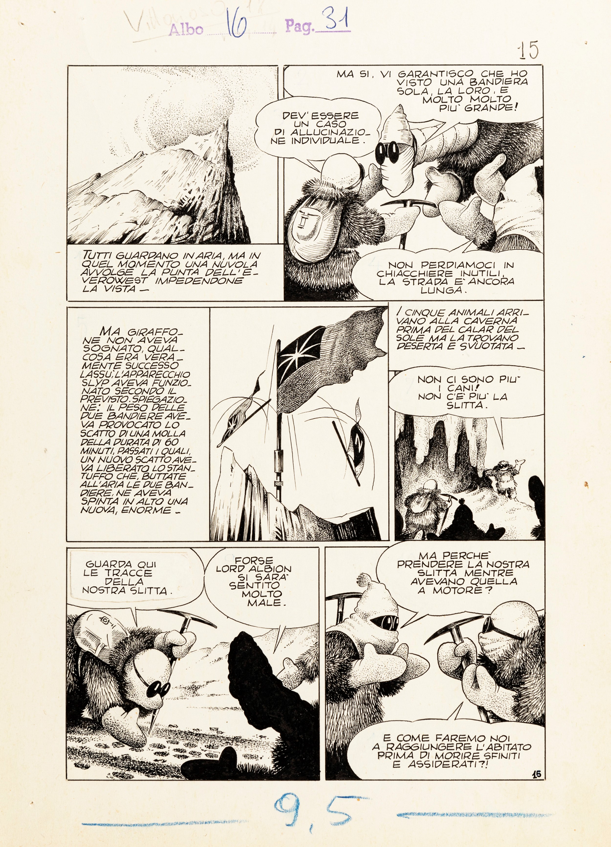 matita e china su cartoncino, 22 x 30,5 cm 1954 Tavola originale realizzata da Craveri per la pag. 15 di Everowest!, edita su Il Vittorioso n. 17 dalle edizioni A.V.E. nel 1954. Colonna portante del giornale cattolico fin dal 1937, Craveri ci regala questa storia capolavoro definita « cineromanzo ad alta quota » che vede come protagonisti i suoi celebri animali antropomorfi di Zoolandia; questa inedita famiglia di animali era composta dal saggio Giraffone che era quasi un padre per il maiale Porcellino, l'orsetto Carboncino, la scimmia Jojo, il gatto Micio e il pesce Aprilino, a cui la volpe Birba faceva da madre. Fori di affissione ai margini.