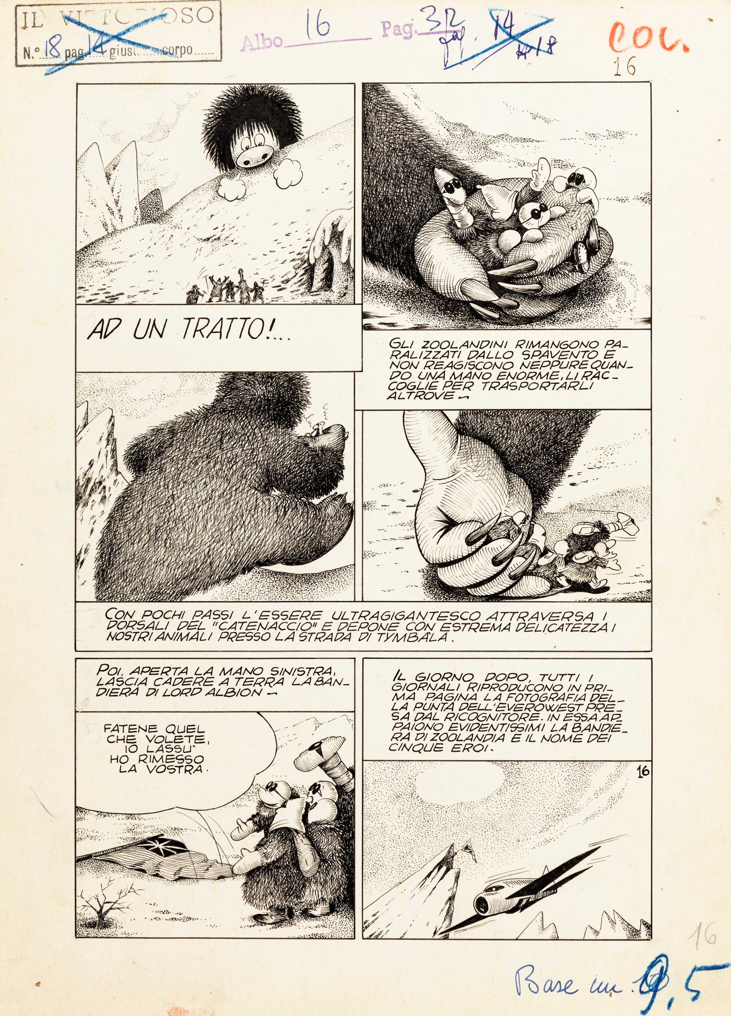 matita e china su cartoncino, 22 x 30,5 cm 1954 Tavola originale realizzata da Craveri per la pag. 16 di Everowest!, edita su Il Vittorioso n. 18 dalle edizioni A.V.E. nel 1954. Colonna portante del giornale cattolico fin dal 1937, Craveri ci regala questa storia capolavoro definita « cineromanzo ad alta quota » che vede come protagonisti i suoi celebri animali antropomorfi di Zoolandia; questa inedita famiglia di animali era composta dal saggio Giraffone che era quasi un padre per il maiale Porcellino, l'orsetto Carboncino, la scimmia Jojo, il gatto Micio e il pesce Aprilino, a cui la volpe Birba faceva da madre. Fori di affissione ai margini. Acquerellata al retro.