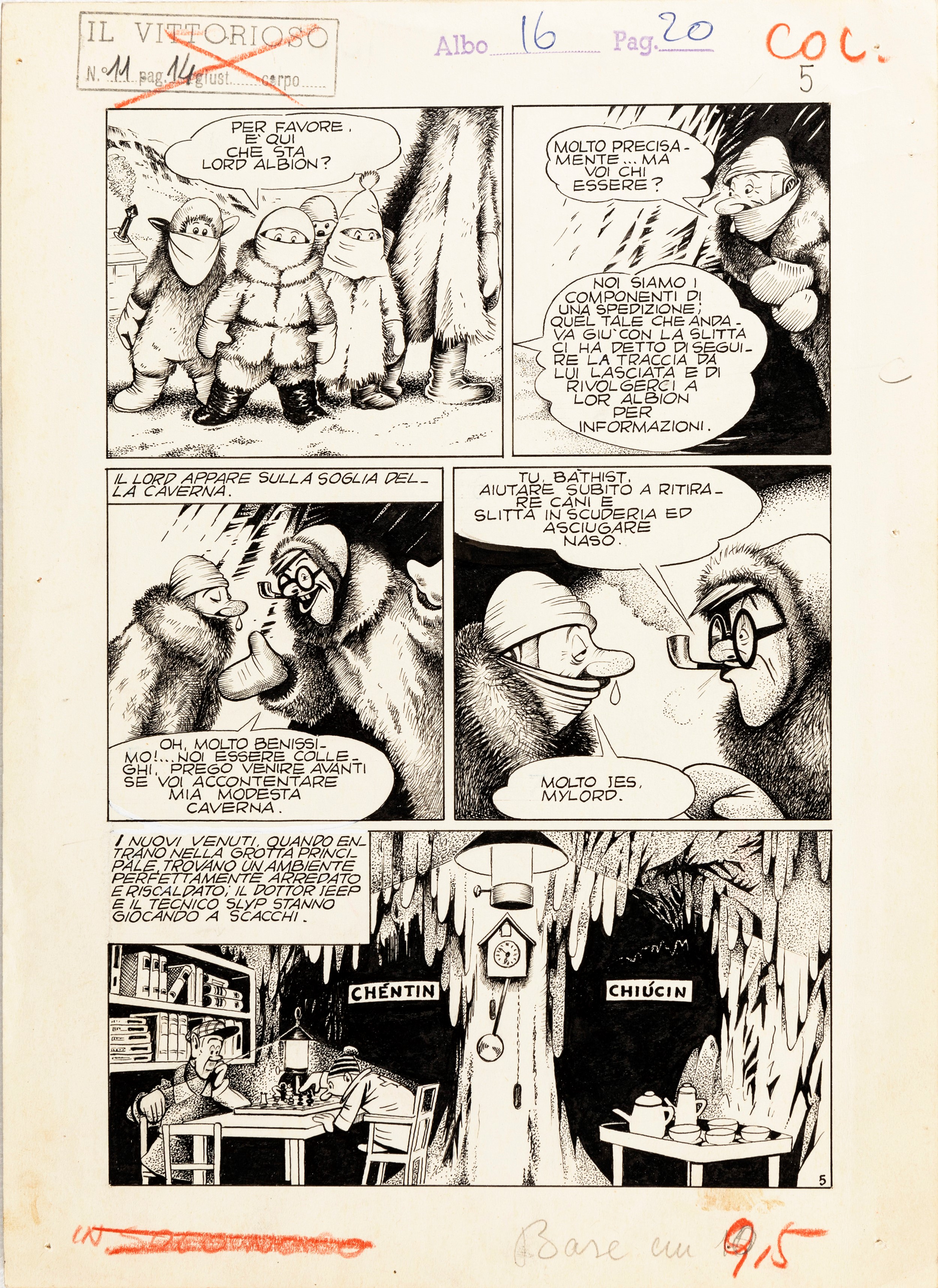 matita e china su cartoncino, 22 x 30,5 cm 1954 Tavola originale realizzata da Craveri per la pag. 5 di Everowest!, edita su Il Vittorioso n. 11 dalle edizioni A.V.E. nel 1954. Colonna portante del giornale cattolico fin dal 1937, Craveri ci regala questa storia capolavoro definita « cineromanzo ad alta quota » che vede come protagonisti i suoi celebri animali antropomorfi di Zoolandia; questa inedita famiglia di animali era composta dal saggio Giraffone che era quasi un padre per il maiale Porcellino, l'orsetto Carboncino, la scimmia Jojo, il gatto Micio e il pesce Aprilino, a cui la volpe Birba faceva da madre. Fori di affissione ai margini. Acquerellata al retro.