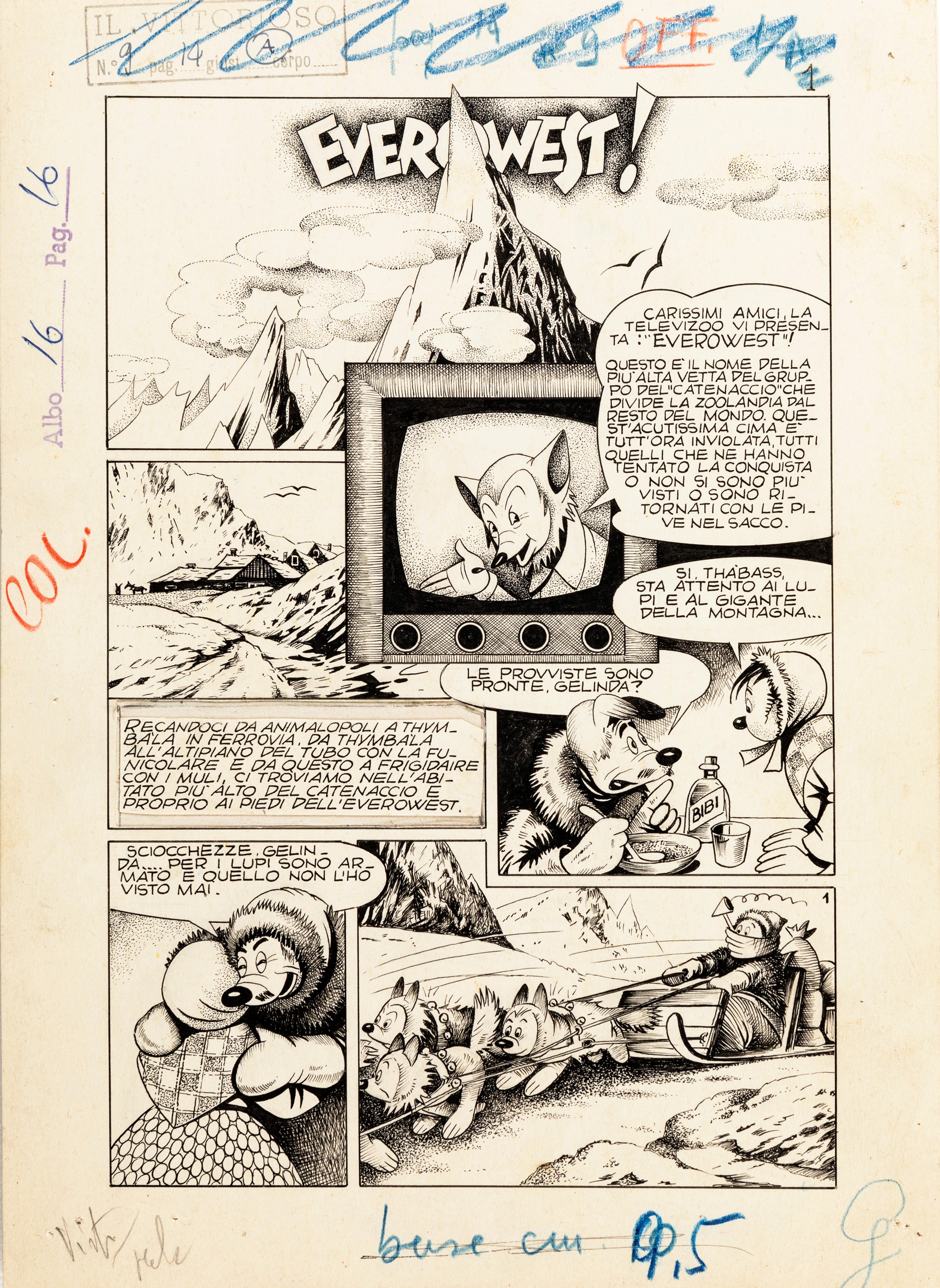matita e china su cartoncino, 22 x 30,5 cm 1954 Title page originale realizzata da Craveri per Everowest!, edita su Il Vittorioso n. 9 dalle edizioni A.V.E. nel 1954. Colonna portante del giornale cattolico fin dal 1937, Craveri ci regala questa storia capolavoro definita « cineromanzo ad alta quota » che vede come protagonisti i suoi celebri animali antropomorfi di Zoolandia; questa inedita famiglia di animali era composta dal saggio Giraffone che era quasi un padre per il maiale Porcellino, l'orsetto Carboncino, la scimmia Jojo, il gatto Micio e il pesce Aprilino, a cui la volpe Birba faceva da madre. Fori di affissione ai margini. Acquerellata al retro.