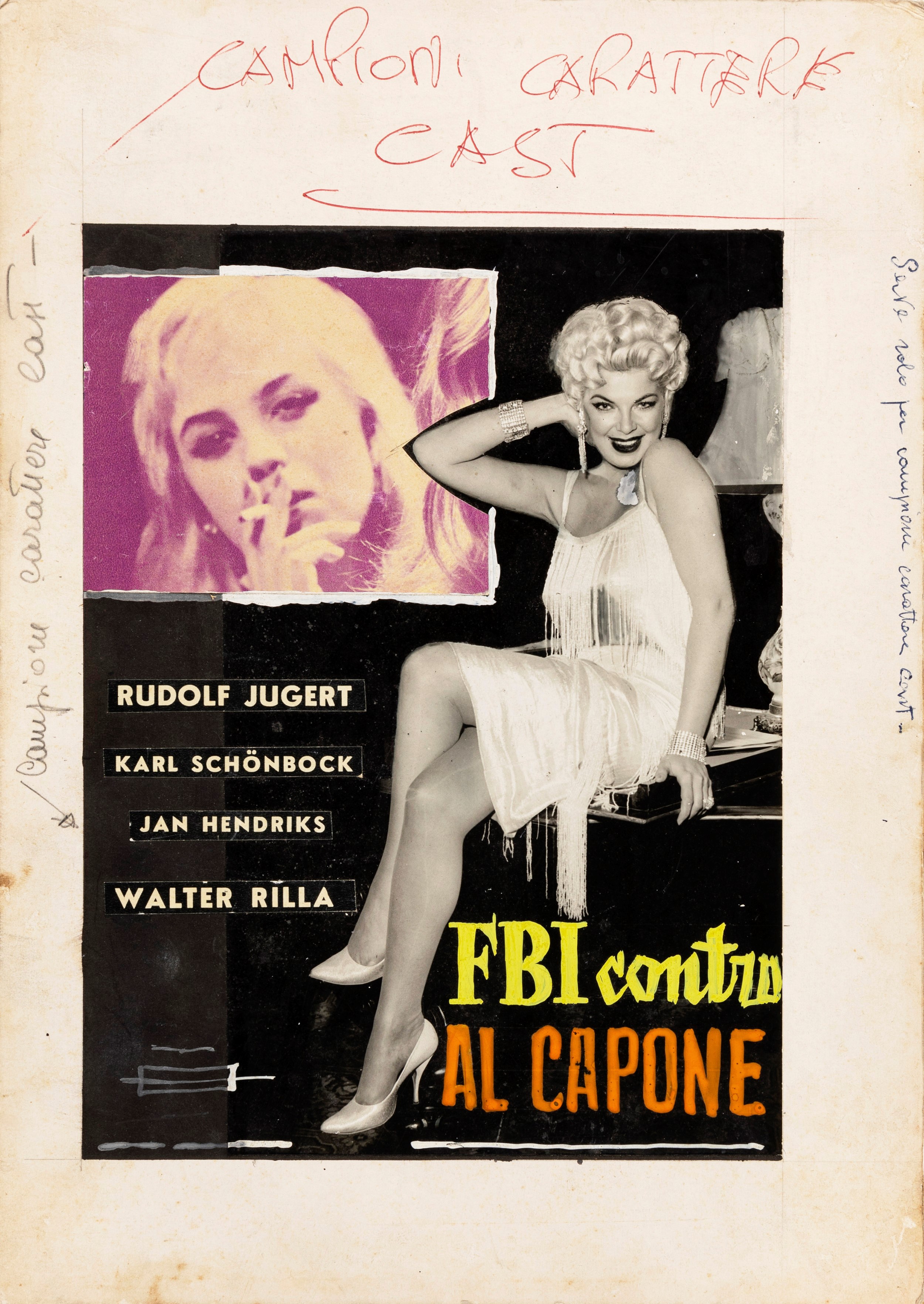 tempera su cartone e pellicola fotografica applicata su cartone, a) 47,5 x 18 cm b-c-d) 25 x 35 cm e)35 x 25 cm 1959 Lotto composto dalla versione italiana del titolo del film F.B.I. contro Al Capone diretto da Phil Karlson con Robert Stack, Neville Brand e Barbara Nichols nel 1959 e da 4 flani fotografici (immagine promozionale destinata a giornali e sale cinematografiche).