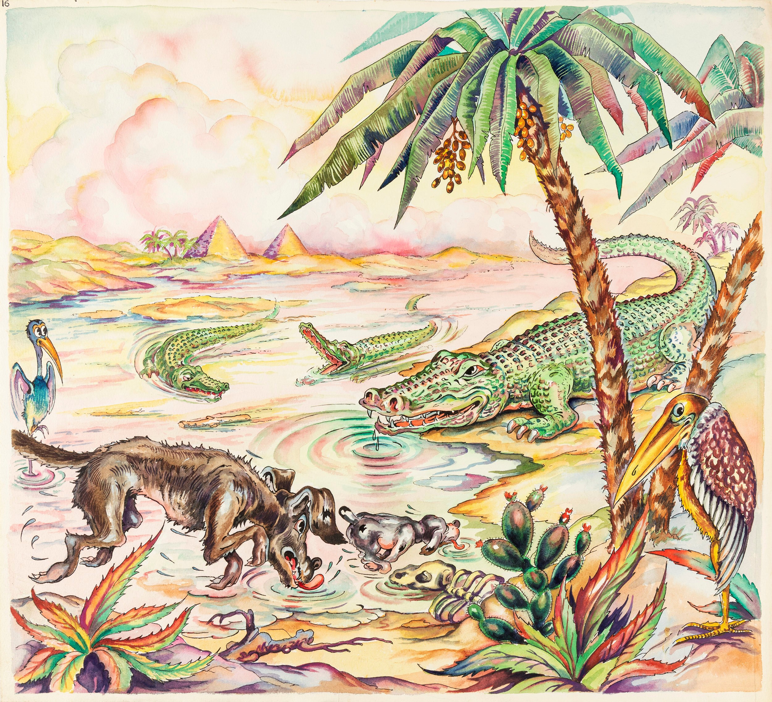 anni '50 Illustrazione originale realizzata da Lucchetti durante gli anni ´50 per Favole esopiane di Fedro, l´episodio si intitola I cani e i coccodrilli.