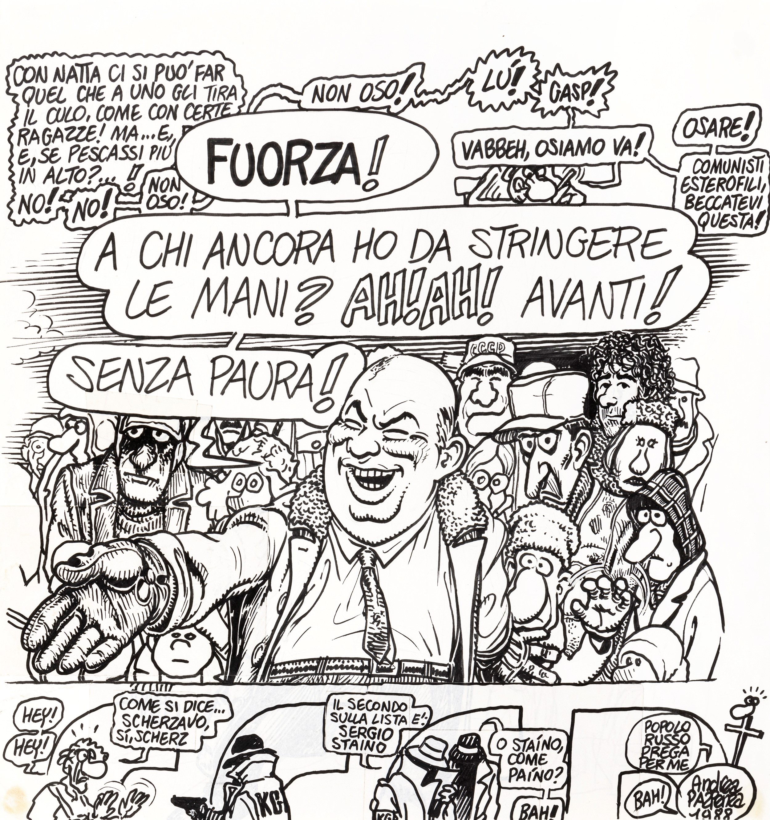 matita e china su cartoncino, 32,5 x 34 cm 1988 Illustrazione originale realizzata da Pazienza e pubblicata sulla rivista Tango n. 96 nel Gennaio 1988. Un irriverente ritratto di Mikhail Gorbaciov con il nostro Paz che ancora una volta decide di auto ritrarsi (in alto a destra tra a folla) senza poter sfuggire alle maglie del KGB. Firmata e datata.