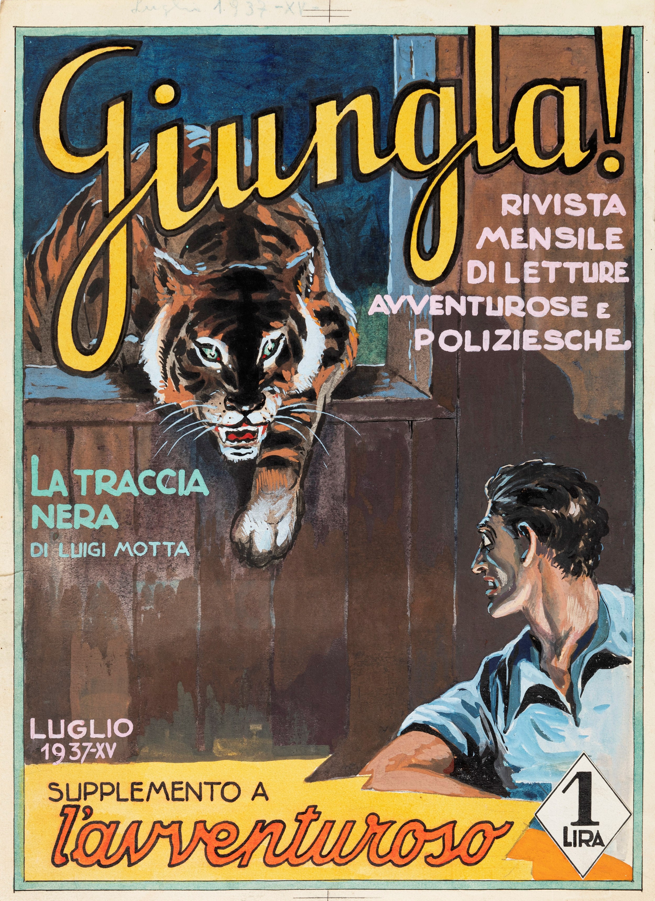 tempera su cartoncino, 24 x 33 cm 1937 Originale di copertina realizzato da Toppi per il primo numero della leggendaria rivista mensile Giungla!, edita da Nerbini nel 1937. Usciranno solo 6 numeri di questa testata a supplemento de L'Avventuroso, Toppi ha qui raggiunto l'apice artistico dell