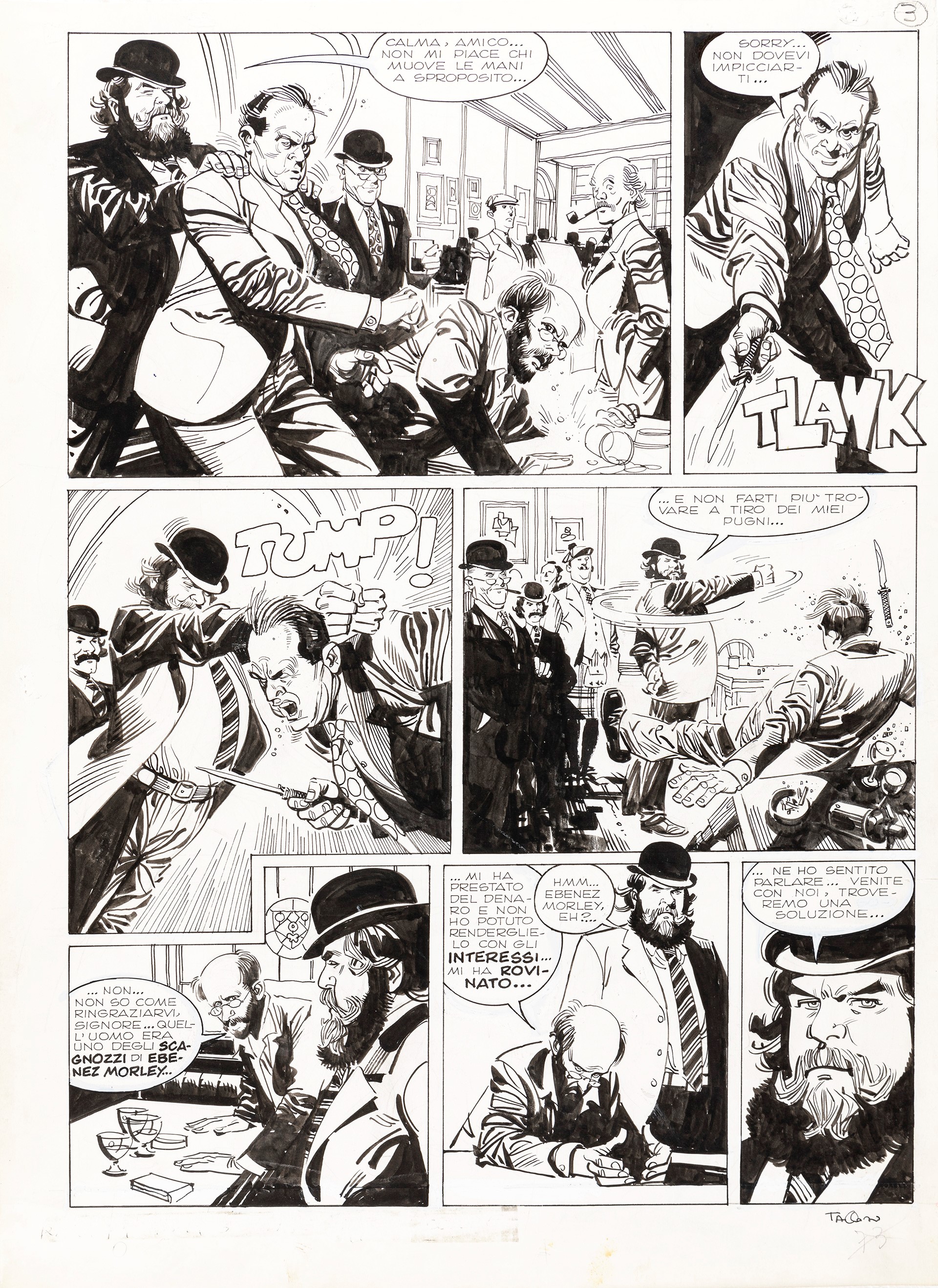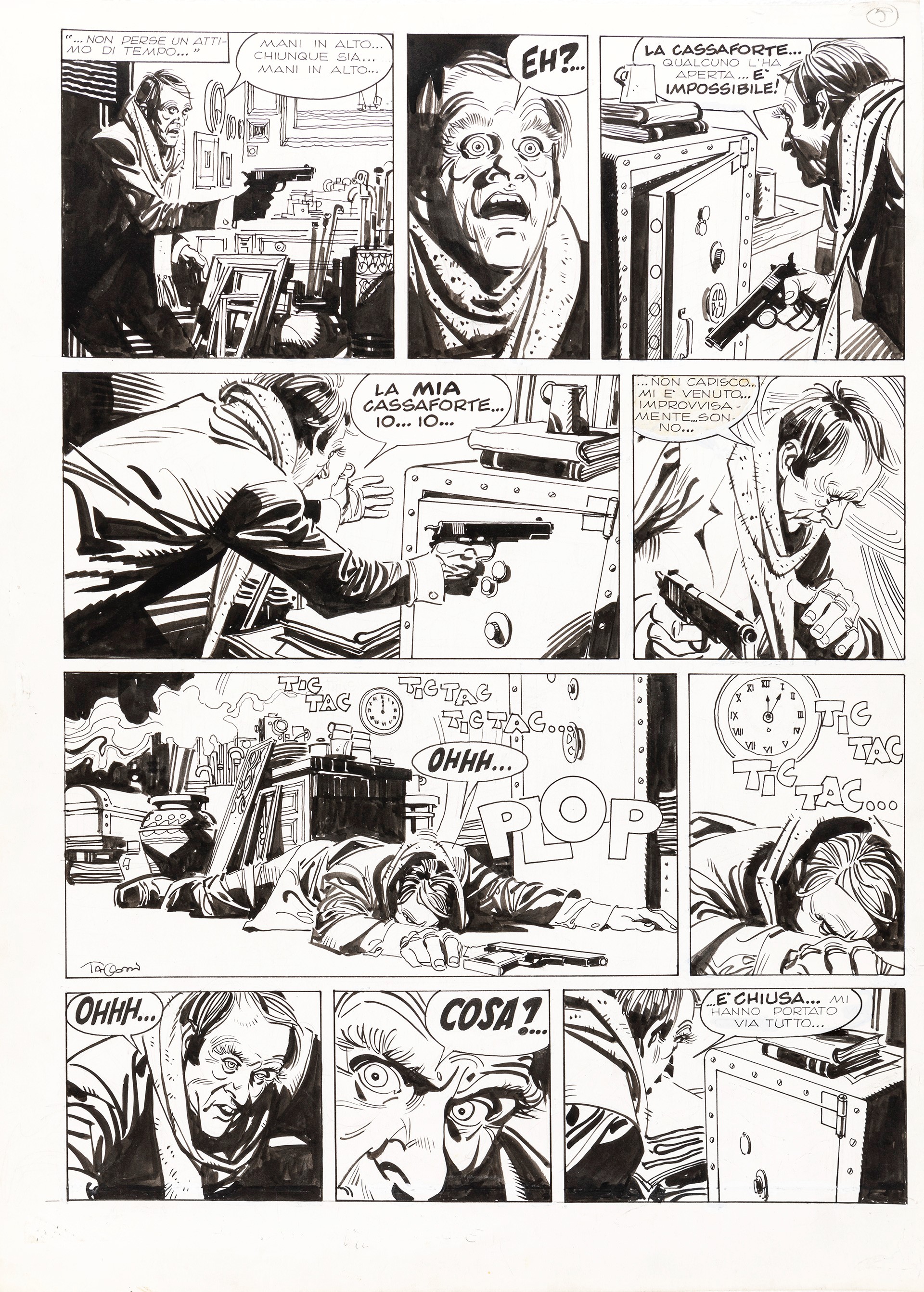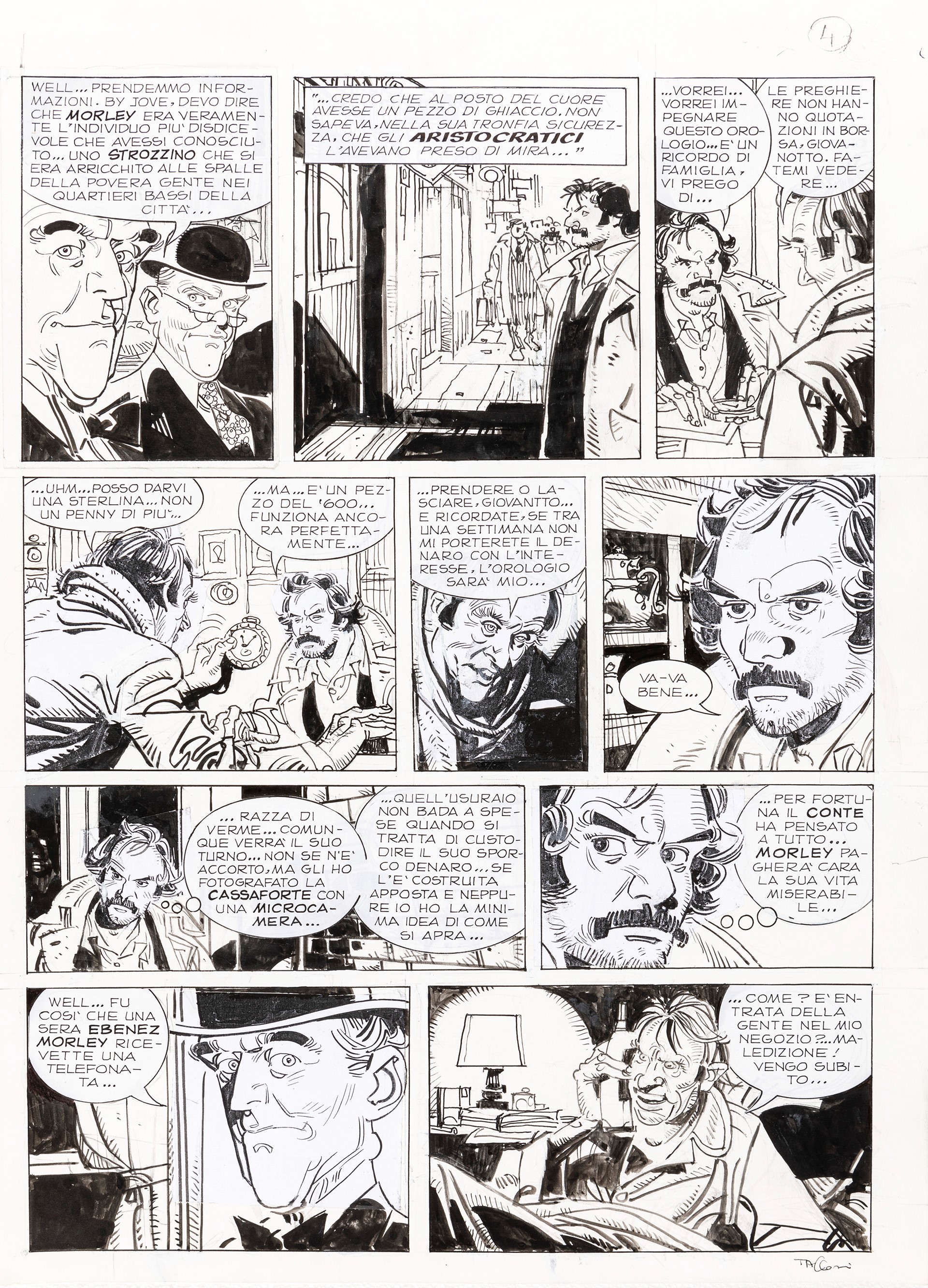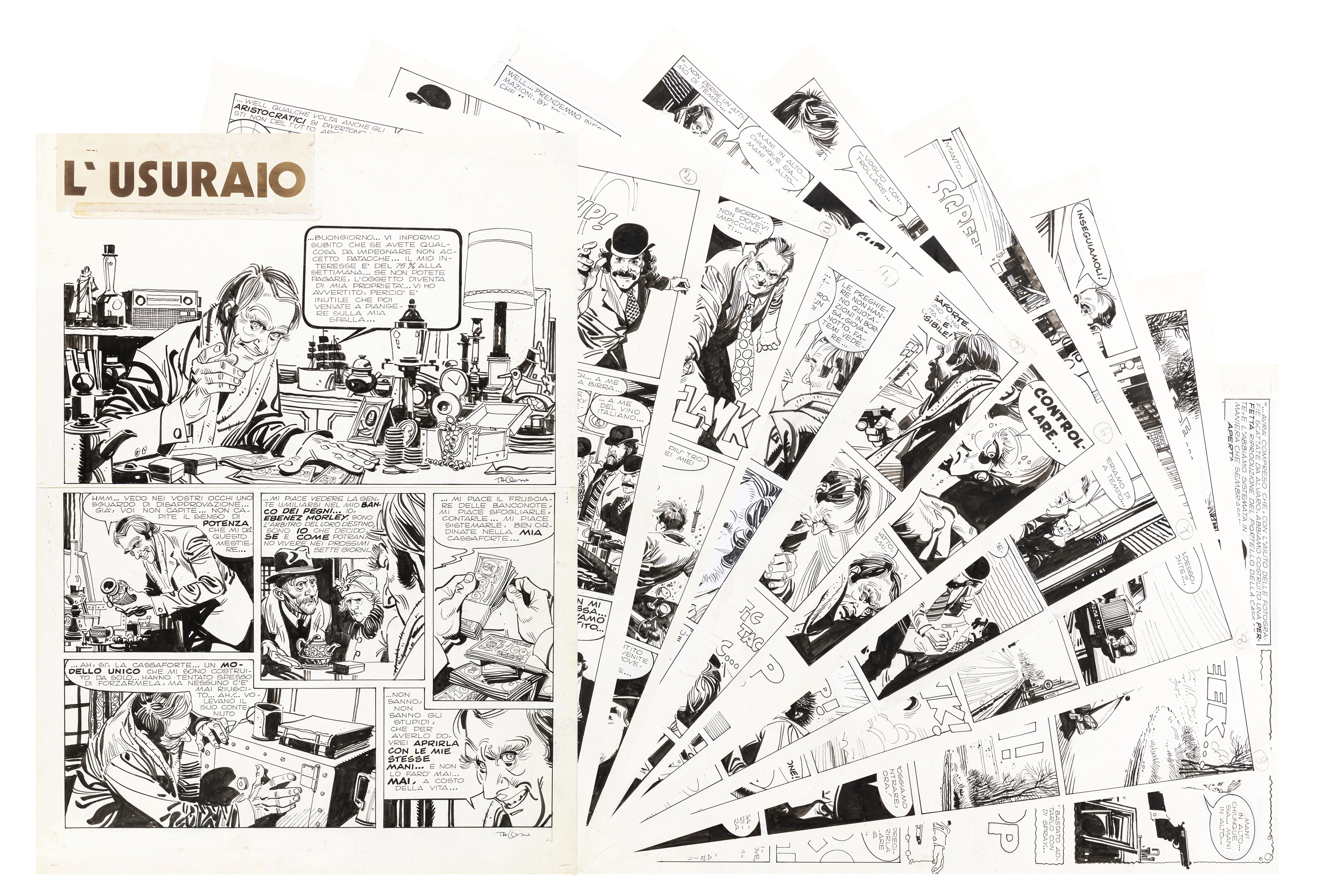 matita e china su cartoncino, 35,5 x 49 cm ciascuno 1973 Storia completa composta da 10 tavole originali realizzate da Tacconi per L'usuraio, avventura de Gli Aristocratici pubblicata per la prima volta sul CdR n. 29 del 1973. Alcune fotocopie nella pag. 4. Firmata in tutte le pagine.