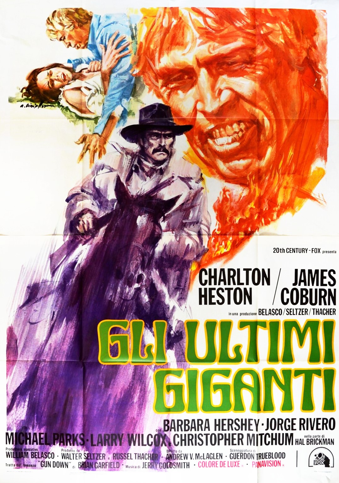 matita e tempera su cartone, 34,5 x 49,5 cm 1976 Bozzetto originale realizzato da Ciriello per la locandina ufficiale del film Gli ultimi giganti, diretto da Andrew V. McLaglen con Charlton Heston, James Coburn e Barbara Hershey nel 1976. Lieve piega all'angolo inferiore destro. Firmato.