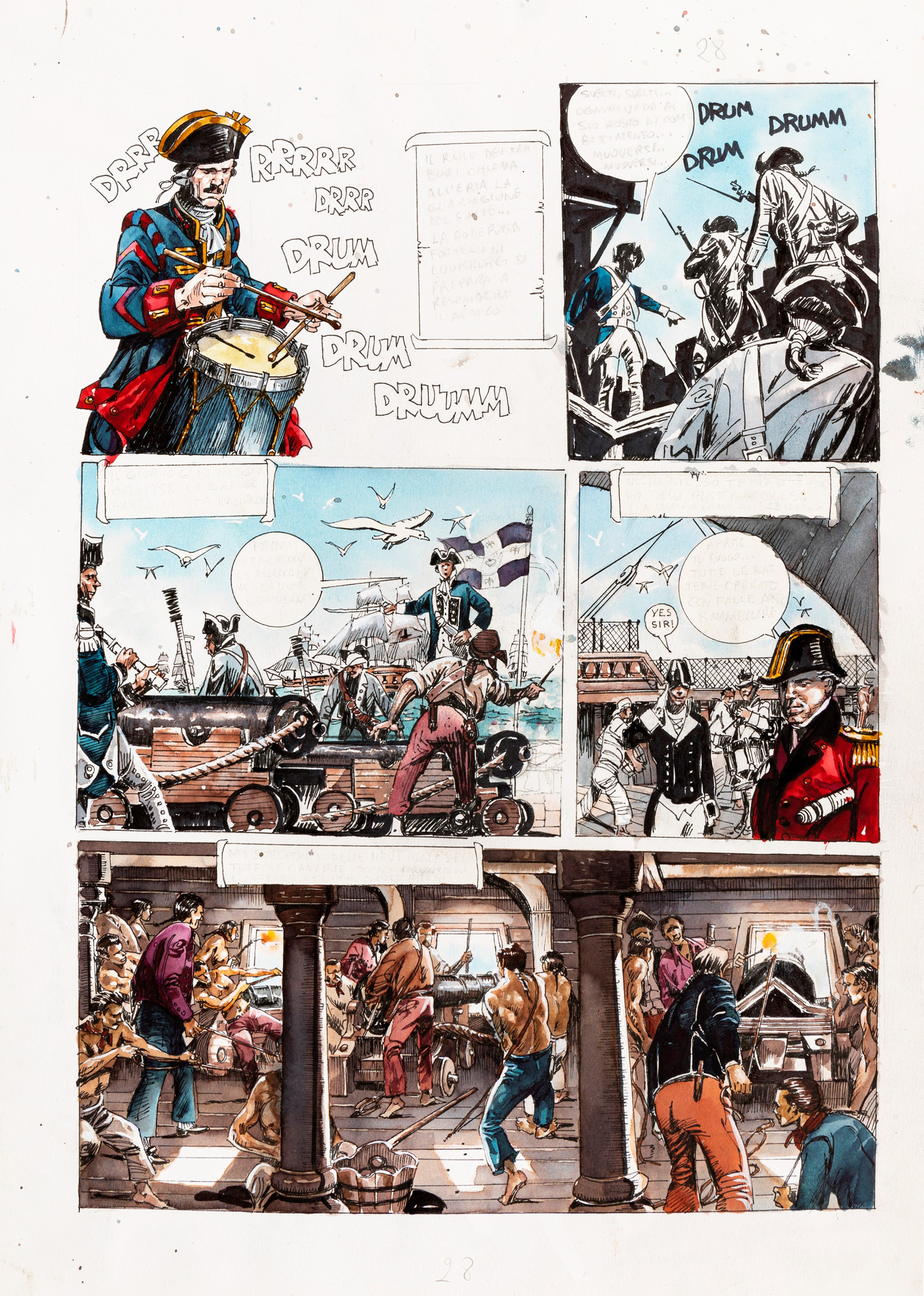 matita, china e acquerello su cartoncino, 35 x 50 cm 2019 Tavola originale realizzata a quattro mani da Calegari e Tisselli per Guerre di frontiera, page 28 di questo affresco storico ideato e scritto da Angelo Nencetti e pubblicato da Nicola Pesce Editore nel 2019. Piccolo strappo al margine destro e piega all'angolo inferiore destro.