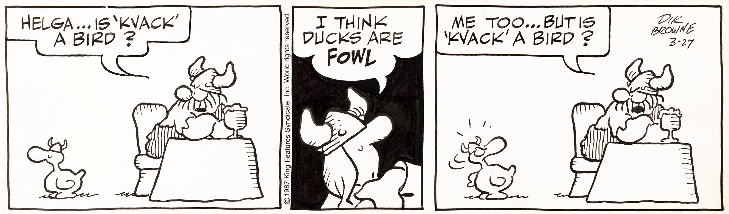 1987 Striscia giornaliera del 27/03/1987 per Hagar the Horrible. Firmata e datata.