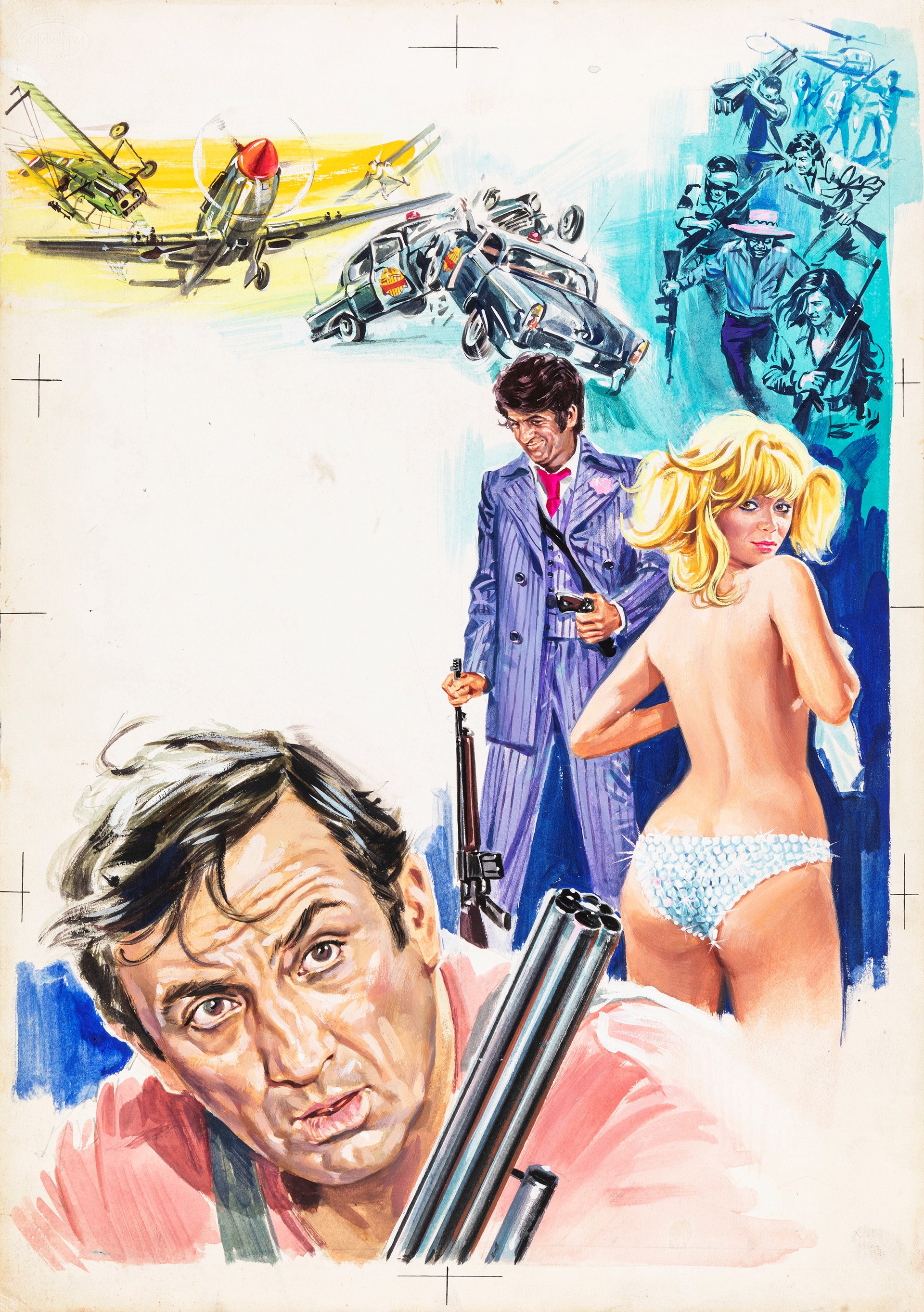 tempera su cartone, 35 x 50 cm 1971 Bozzetto originale realizzato da Maro per la locandina ufficiale del film Il bikini di diamanti, diretto da Gérard Pirès con Mireille Darc e Lino Ventura nel 1971. Opera utilizzata nel 1972 per la riedizione del film con il titolo Il rompiballe... rompe ancora.