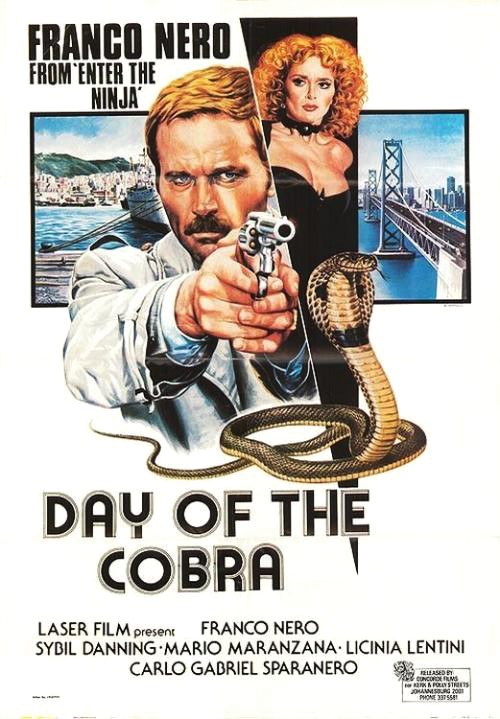 tempera su cartone, 36,5 x 51 cm 1980 Bozzetto originale realizzato da Napoli per la versione europea della locandina ufficiale del film Il giorno del Cobra, diretto da Enzo G. Castellari con Franco Nero, Mario Maranzana e Licinia Lentini nel 1980. Un cult del genere poliziesco all'italiana. Firmato.