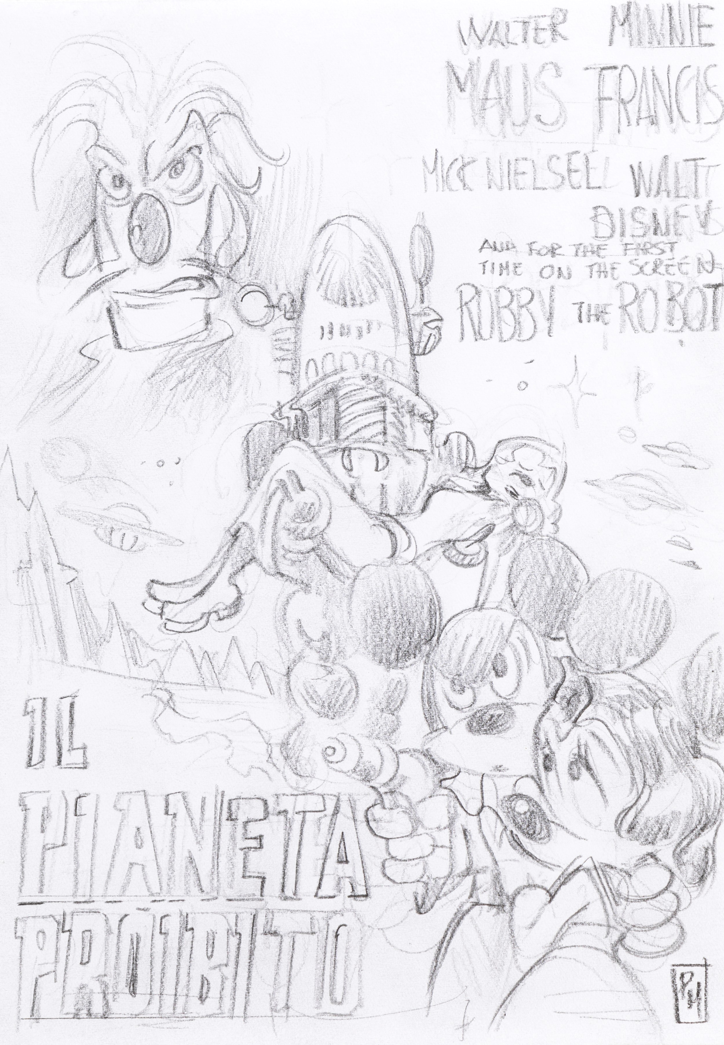 anni 2010 Disegno preliminare realizzato da Mottura per un suo omaggio in stile Disney al film Il pianeta proibito. Firmato.
