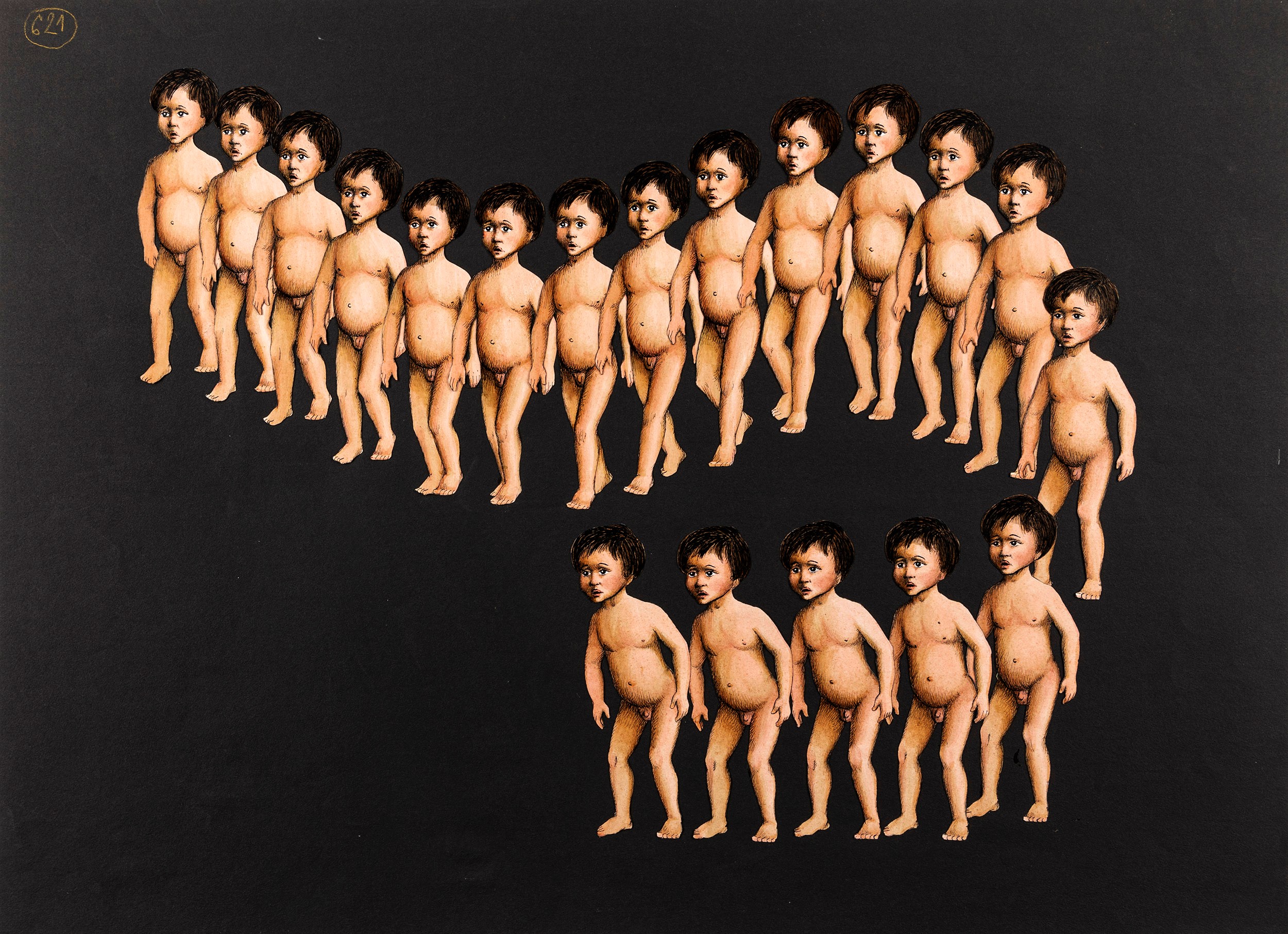 tecnica mista su cartoncini sagomati applicati su cartoncino nero, 62,5 x 45,5 cm 1973 Disegno di produzione realizzato da Topor per il film d'animazione Il pianeta selvaggio diretto da René Laloux nel 1973, insignito del premio speciale al 26° Festival di Cannes. Uno dei più grandi capolavori dell'animazione di tutti i tempi, una vera e propria opera d'arte dai contenuti forti e carichi di poesia, Il pianeta selvaggio è il frutto della collaborazione tra il regista francese Renè Laloux e il poliedrico artista Roland Topor che ha curato tutta la parte grafica del film, realizzando una sorta di incrocio tra il Surrealismo di Salvador Dalì e l'immaginario esoterico e bizzarro di Hieronymus Bosch, il tutto caratterizzato da un'animazione rigida che ricorda i deliri cartooneschi realizzati da Terry Gilliam per i Monty Python.