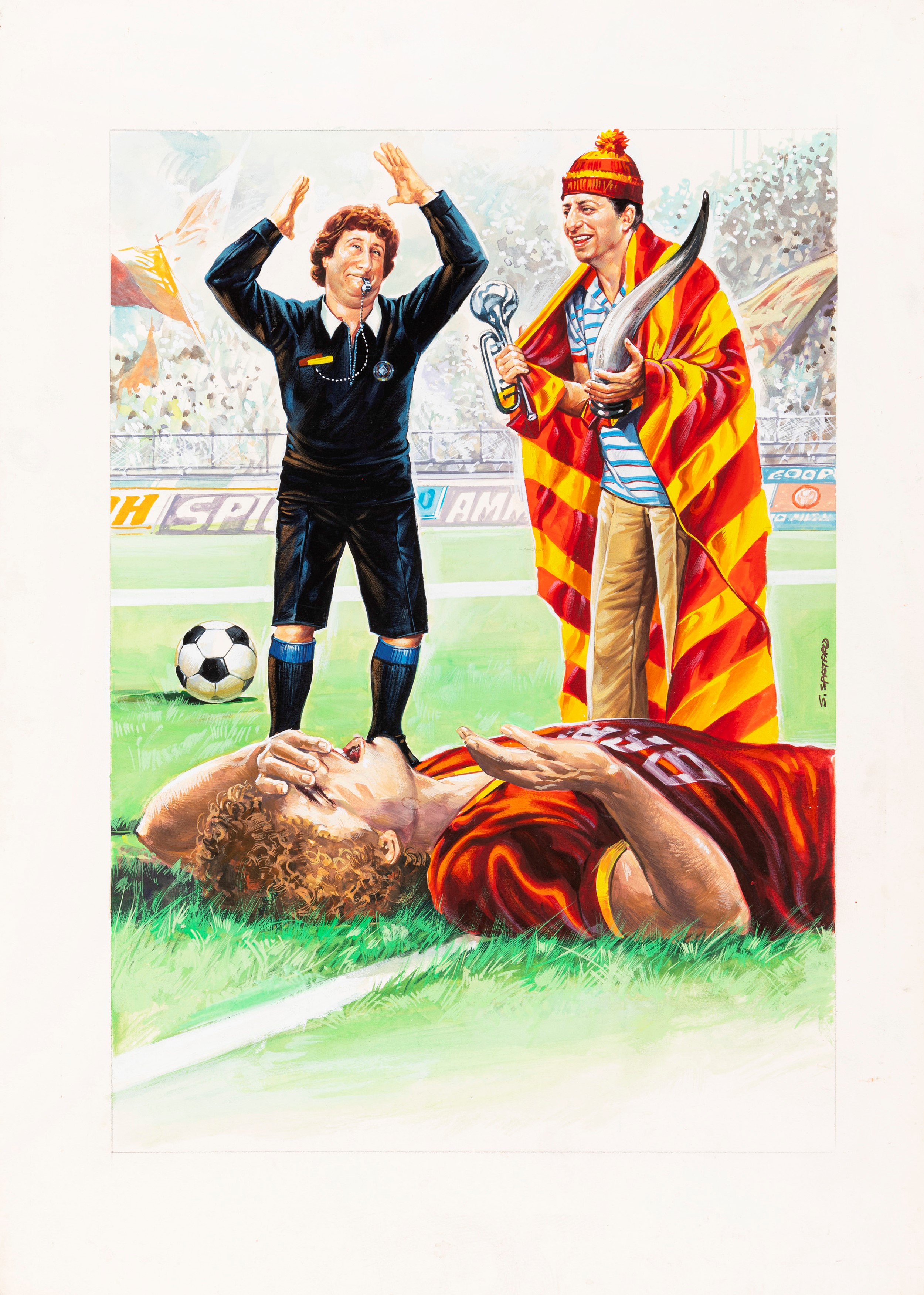 tempera su cartone, 36,5 x 51 cm 1982 Bozzetto originale realizzato da Spataro per la locandina ufficiale del film Il tifoso, l'arbitro e il calciatore, diretto da Pier Francesco Pingitore con Alvaro Vitali, Pippo Franco e Carmen Russo nel 1982. Firmato.