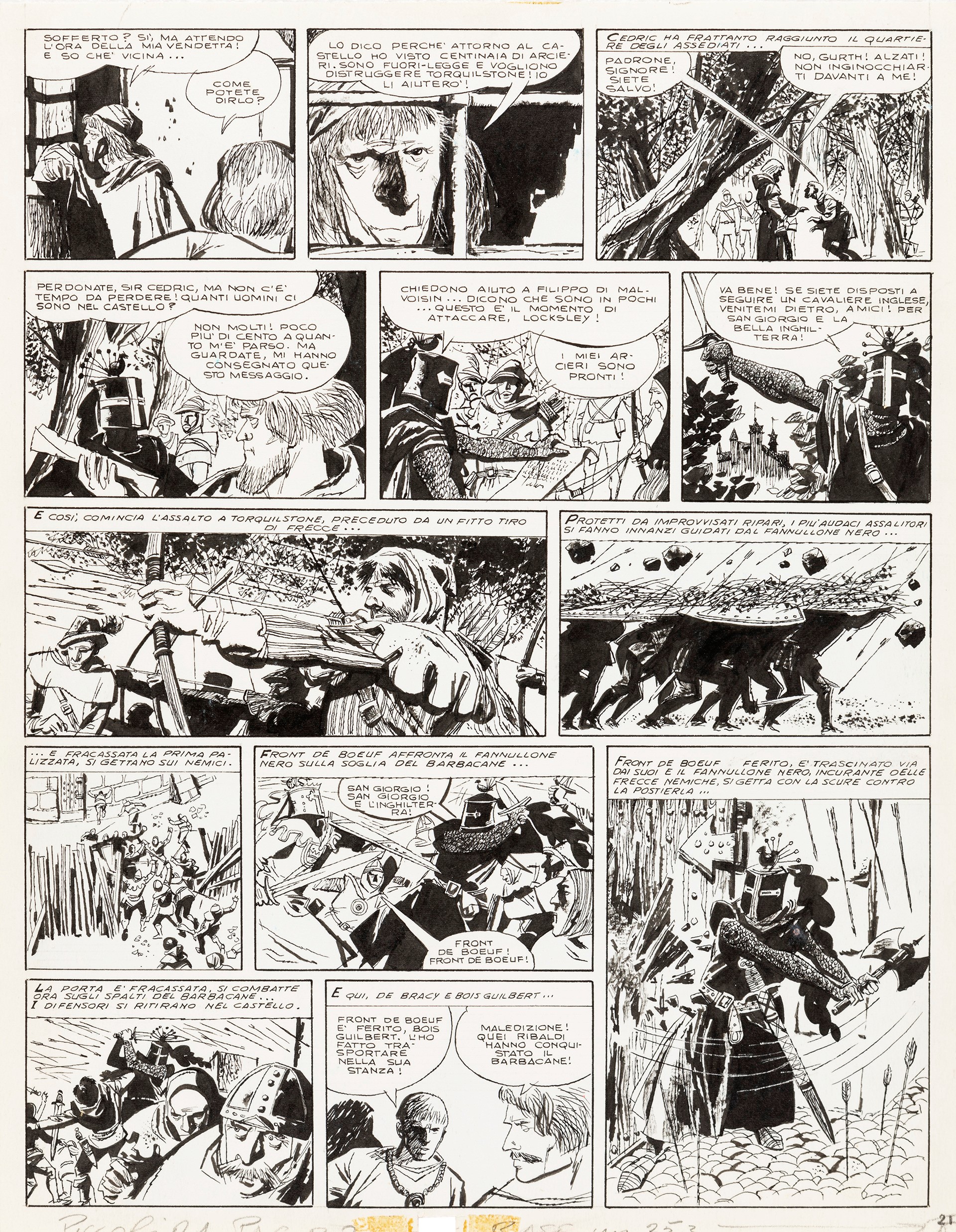 matita e china su cartoncino, 27 x 34,5 cm 1965 Tavola originale realizzata da Battaglia per la pag. 21 di Ivanhoe, adattamento a fumetti del classico di Walter Scott edito per la prima volta nel 1965 e successivamente sul volume I Crociati dalle edizioni Il Gatto e la Volpe nel 1982. Colorata a temp