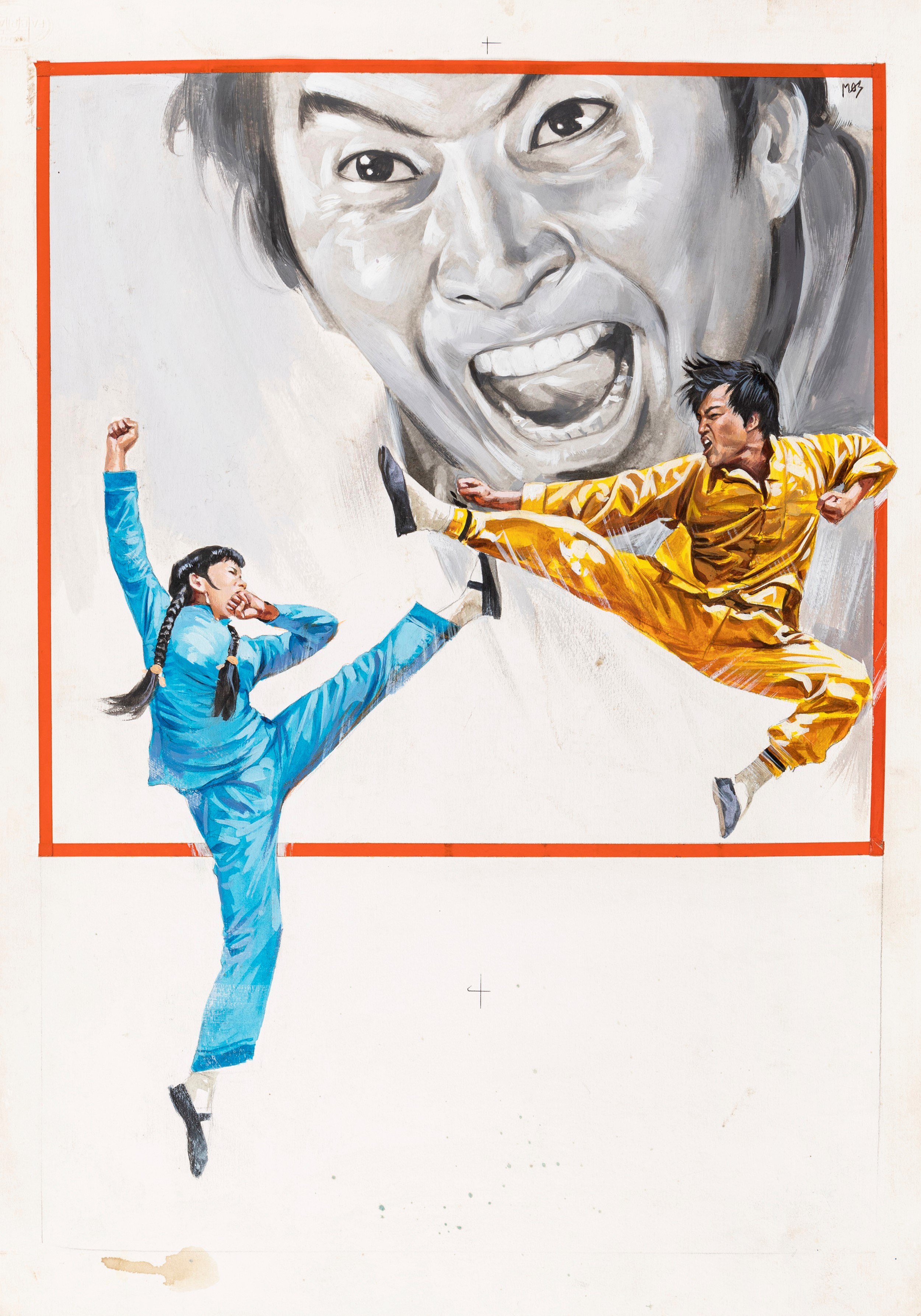 tempera su cartone, 34 x 49 cm 1973 Bozzetto originale realizzato da De Berardinis per la locandina del film King: il massacratore del Kung-Fu, prodotto da Li Guan Sang con Tarng Long nel 1973. Firmato.