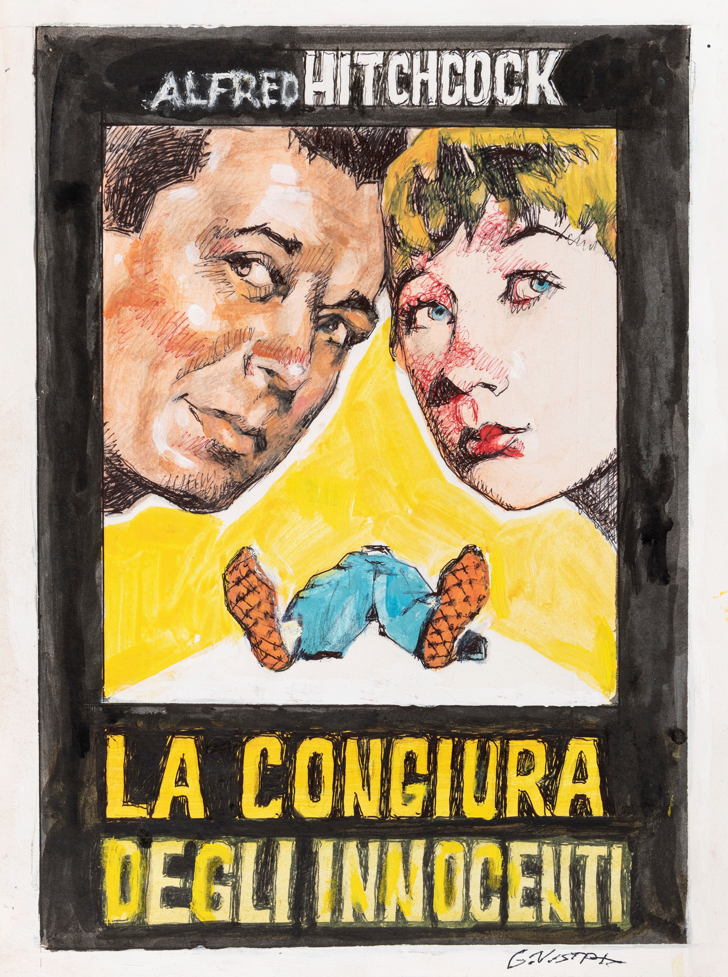 china e tempera su cartoncino, 21,5 x 29 cm 1955 Bozzetto preliminare realizzato da Giuliano Nistri per la locandina ufficiale del film La congiura degli innocenti, diretto da Alfred Hitchcock con Edmund Gwenn, John Forsythe e Shirley MacLaine nel 1955. Firmato.