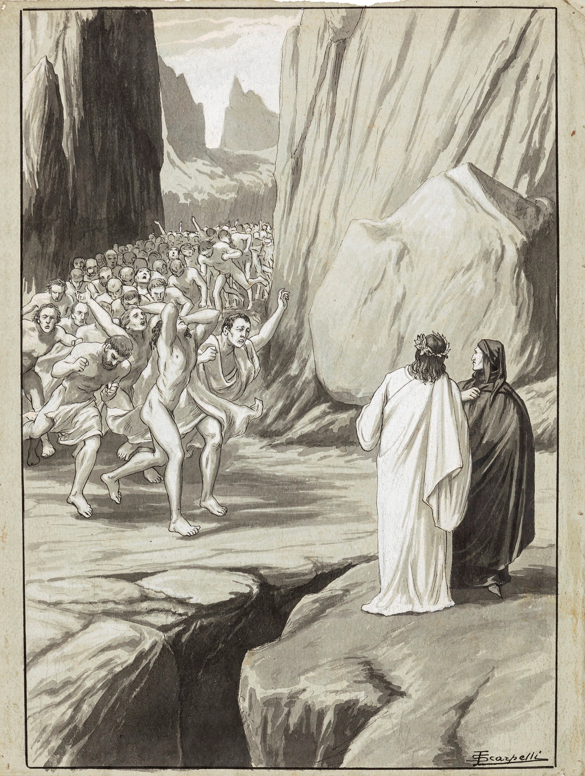 1908 Illustrazione originale realizzata da Scarpelli per La Divina Commedia, pubblicata nel Purgatoio da Nerbini nel 1908. Fori di affissione agli angoli. Firmata.