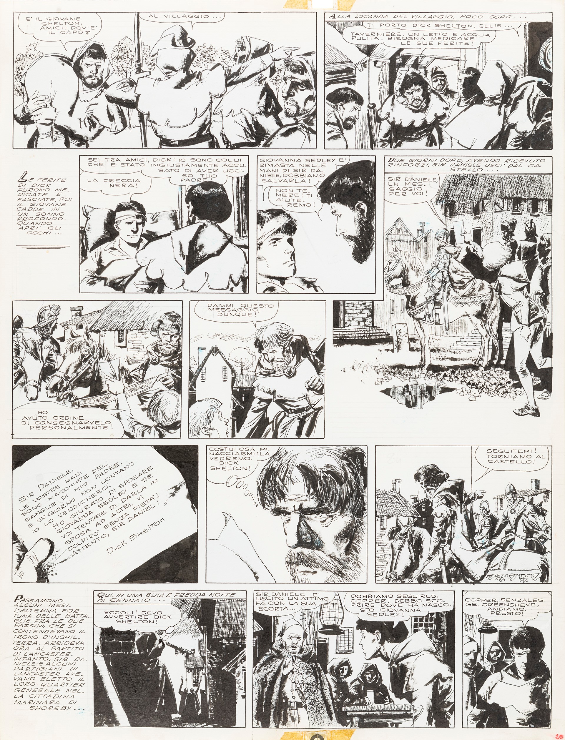 matita e china su cartoncino, 33,5 x 44 cm 1963 Tavola originale realizzata da Battaglia per la pag. 20 de La freccia nera, adattamento a fumetti del classico di Robert Louis Stevenson edito per la prima volta nel 1963 e successivamente sul volume I Crociati dalle edizioni Il Gatto e la Volpe nel 198