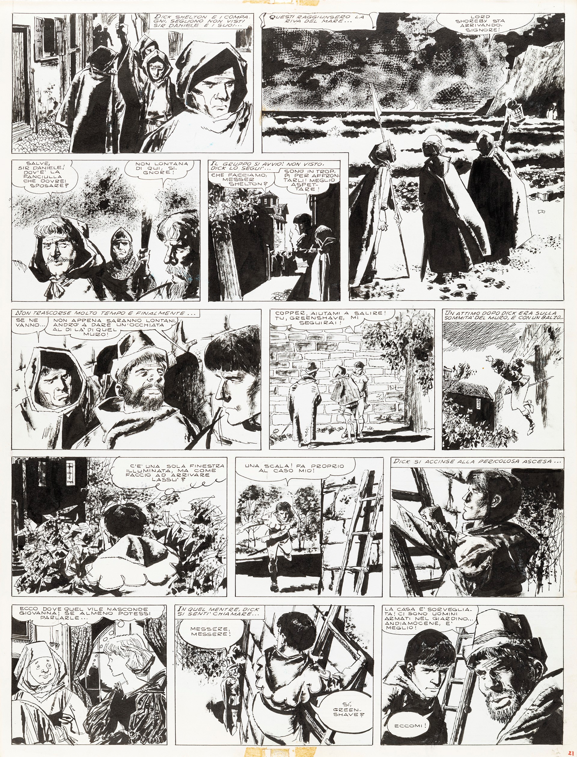 matita e china su cartoncino, 33,5 x 44 cm 1963 Tavola originale realizzata da Battaglia per la pag. 21 de La freccia nera, adattamento a fumetti del classico di Robert Louis Stevenson edito per la prima volta nel 1963 e successivamente sul volume I Crociati dalle edizioni Il Gatto e la Volpe nel 198