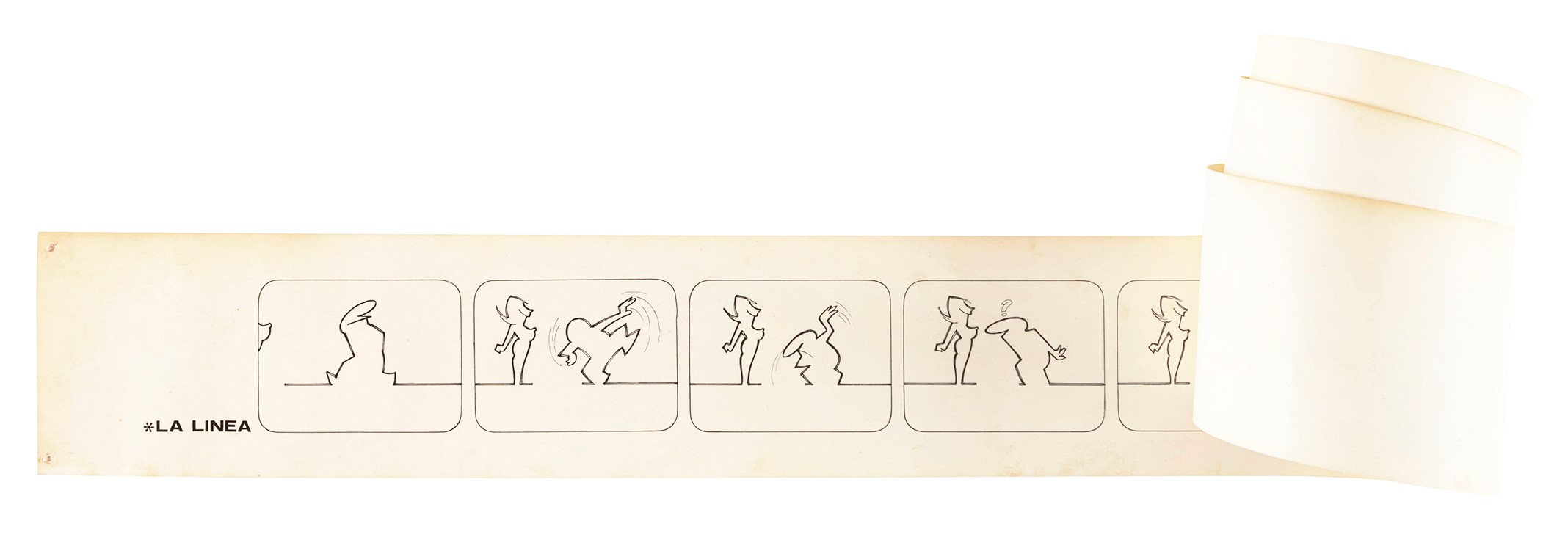 matita, china e collage su cartoncino, 150 x 9,5 cm 1972 Striscia originale realizzata da Cavandoli per il suo celebre personaggio La Linea. Nato nel 1968 con Carosello come personaggio animato, Cavandoli decide negli anni a venire di trasformare il suo omino in un personaggio su carta pubblicando diversi libri illustrati tra cui La Linea di O. Cavandoli edito da Bompiani nel 1973 e successivamente su Il Giornalino dal 1975. Un'opera maestosa e geniale racchiusa in ben 16 vignette. Un pezzo da museo. Fori di affissione agli angoli, conservata all'interno di un tubo. Firmata e datata.