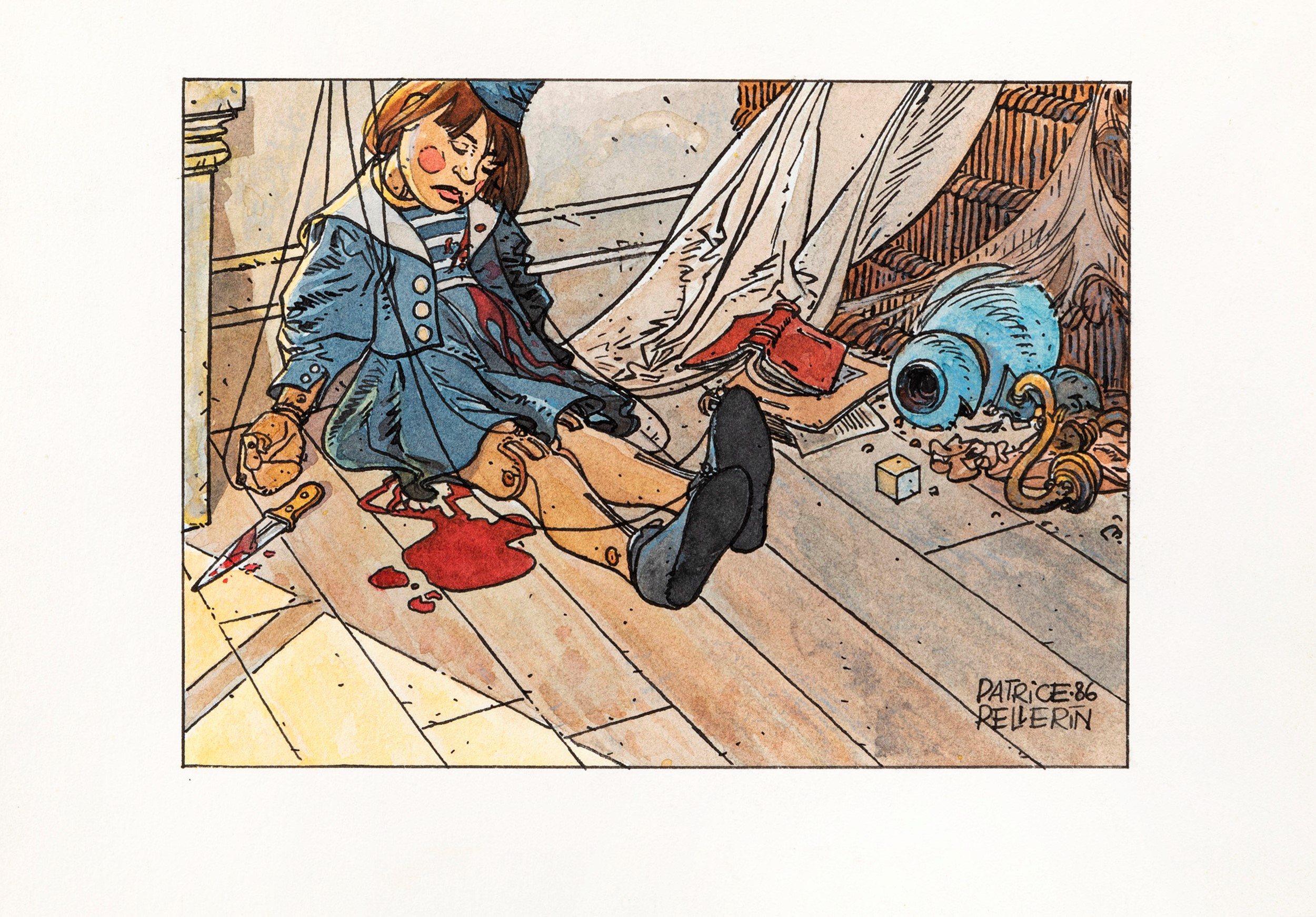 china e acquerello su cartone, 21 z 14,5 cm 1986 Illustrazione originale realizzata dal francese Pellerin in occasione della mostra Pinocchio graphis: un naso lungo duecento disegni inediti tenutasi a Venezia nel 1986, edita sull'omonimo catalogo dall´Editrice Montagna nel 1987. Firmata e datata al fronte e al retro.
