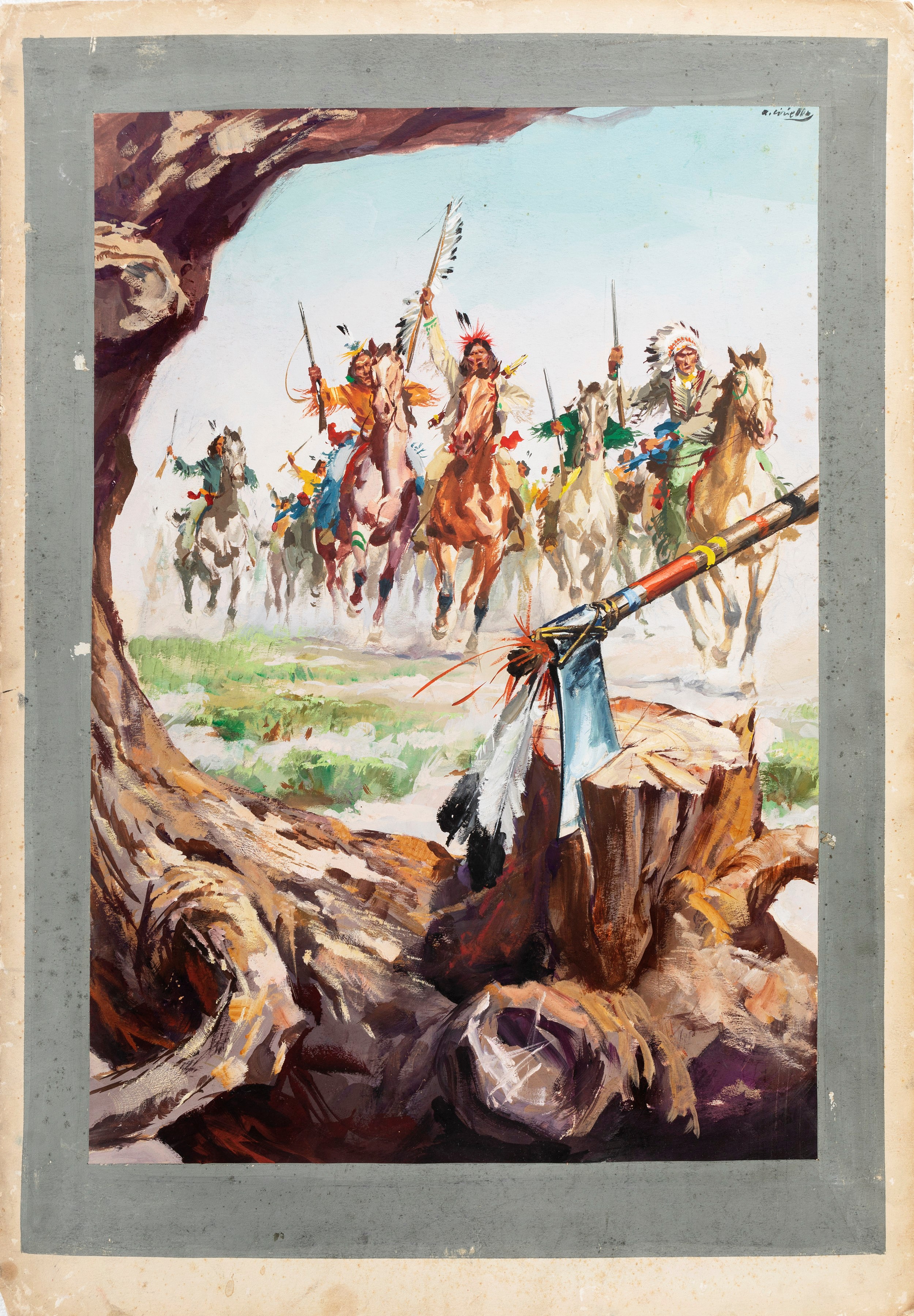 tempera su cartone, 49 x 69 cm 1957 Bozzetto originale realizzato da Ciriello per la locandina ufficiale del film La pista dei Tomahawks, diretto da Lesley Selander con Chuck Connors, John Smith e Susan Cummings nel 1957. Piccola mancanza all'angolo inferiore sinistro. Firmato.