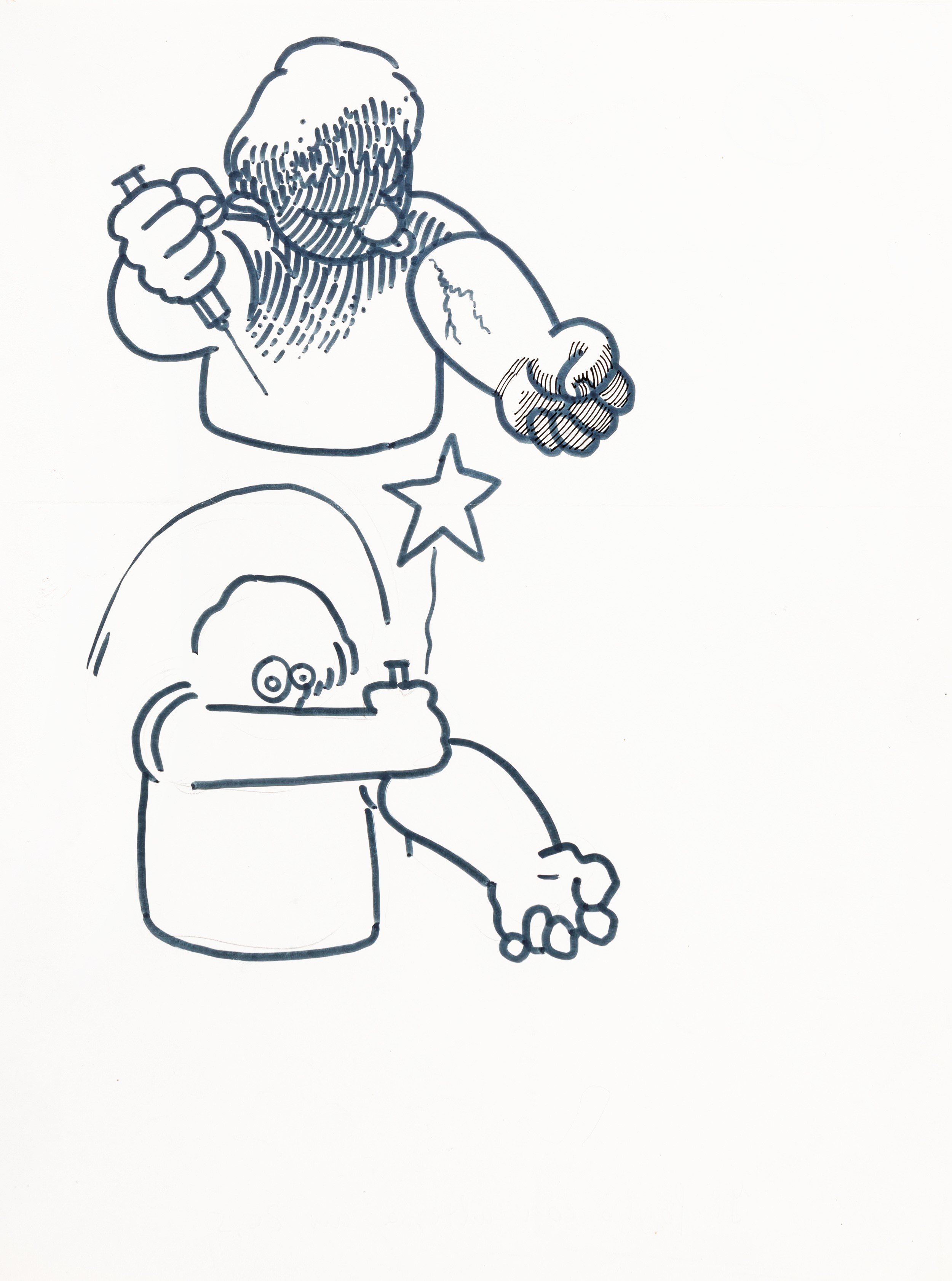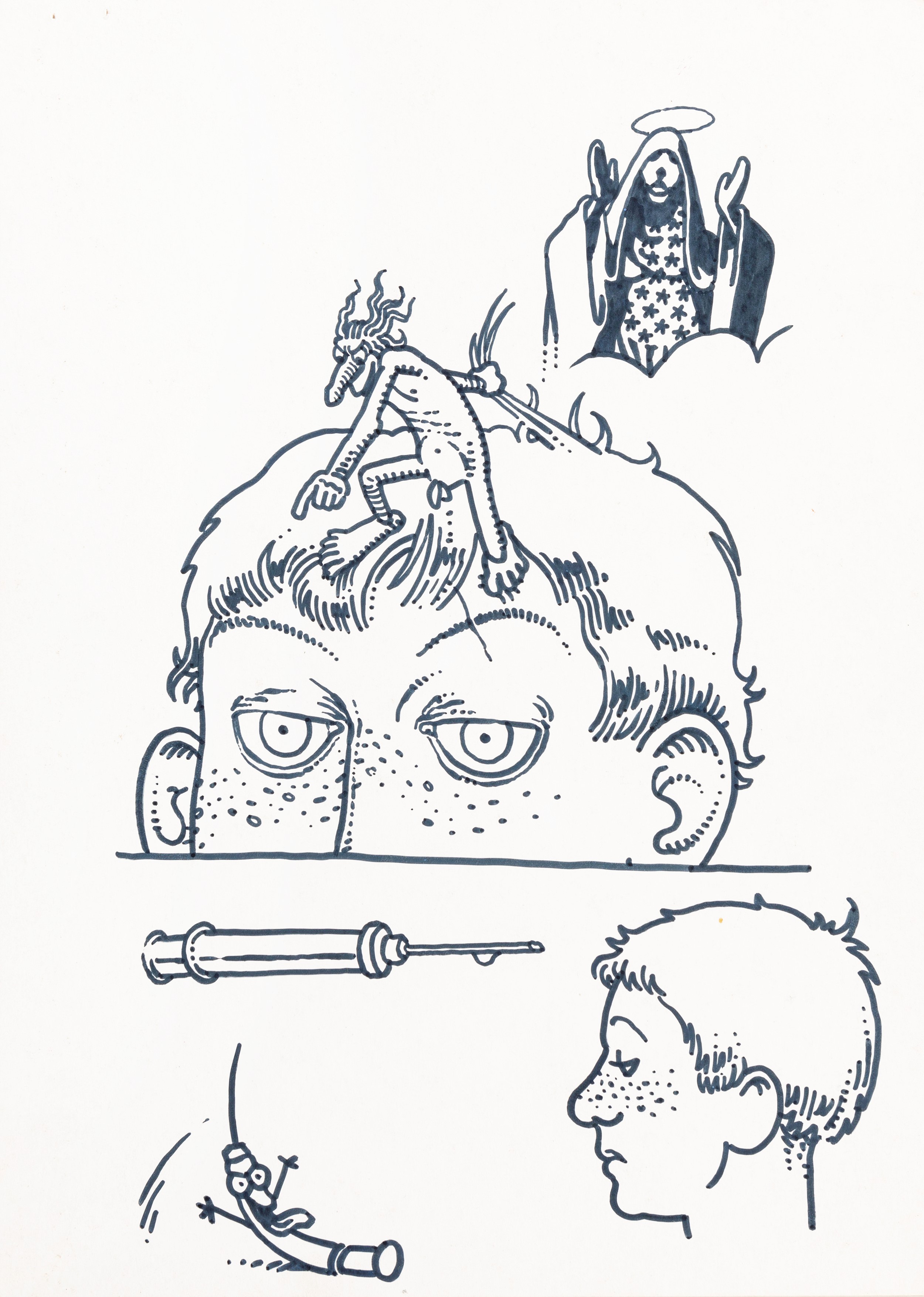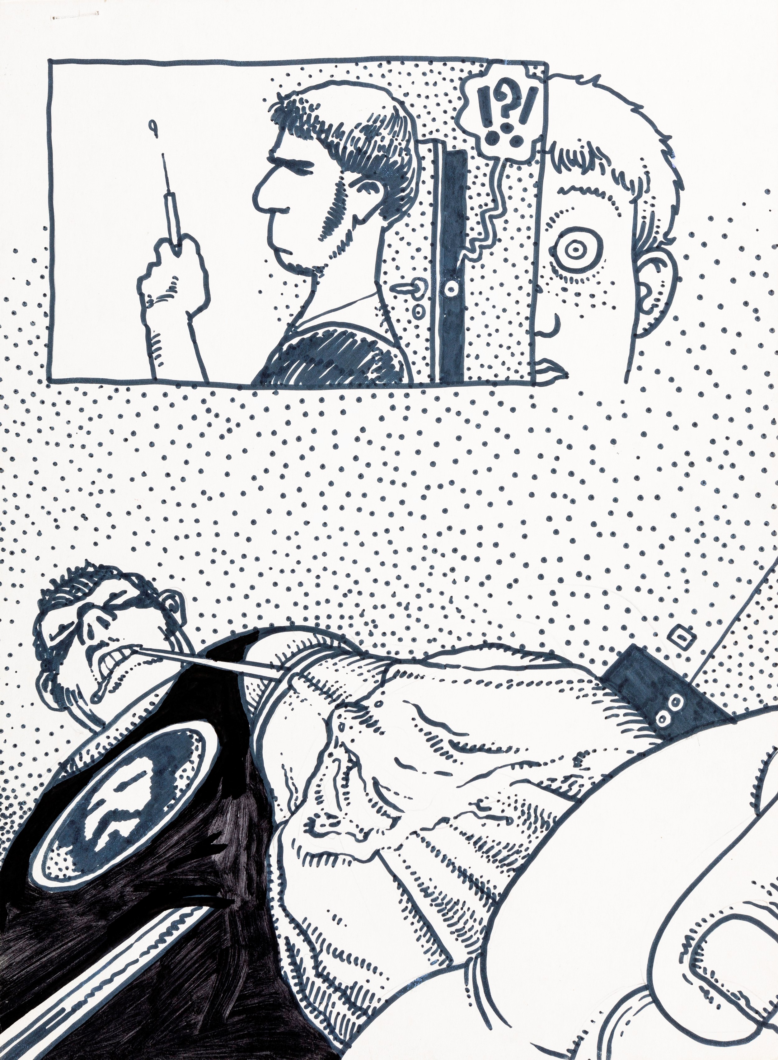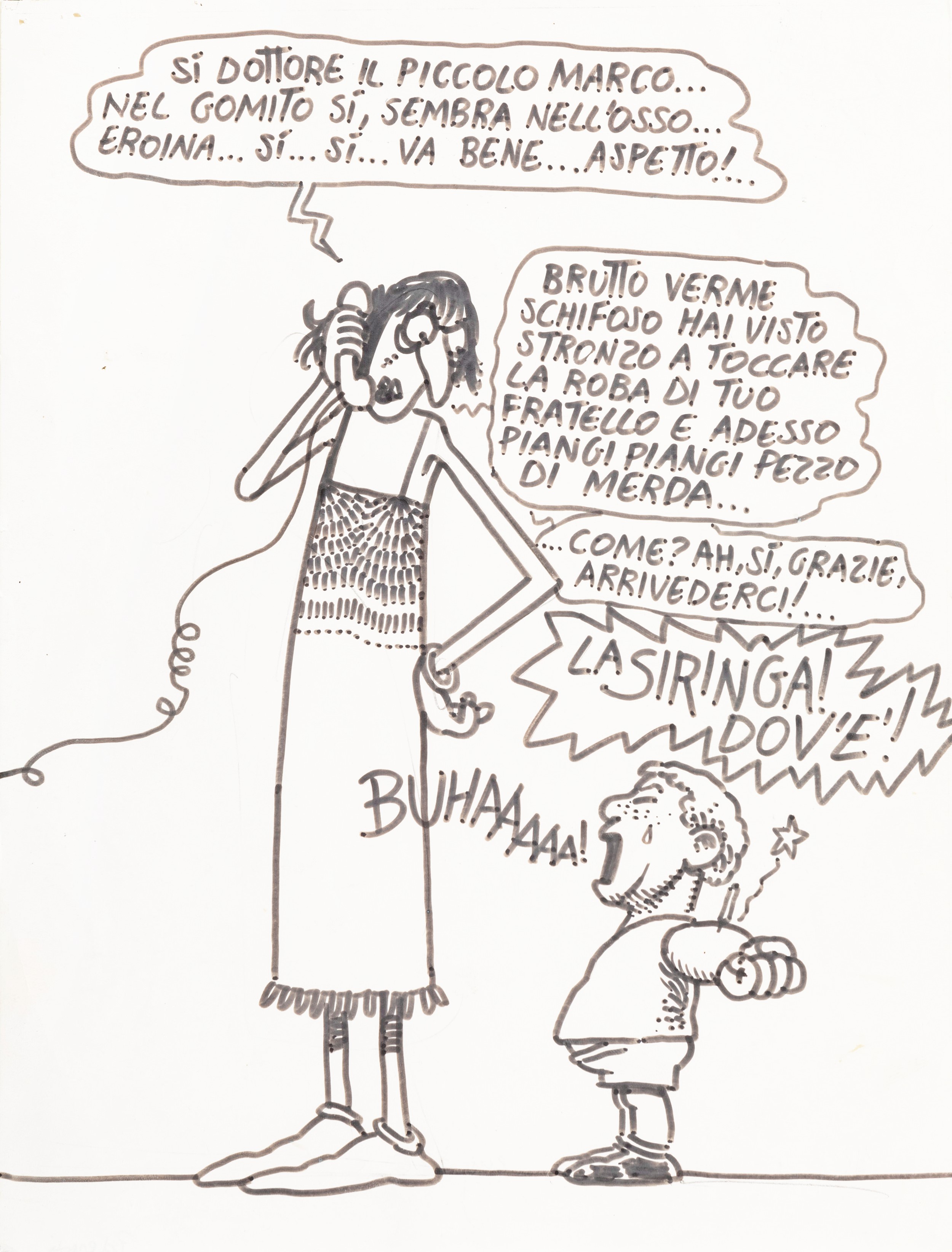 matita e pennarello su cartoncino e carta, 21,5 x 29,5 cm e 20 x 26,5 cm 1978 Storia completa composta da 5 tavole originali realizzate da Pazienza per la rivista Cannibale n. 4 nel Novembre 1978, recentemente ristampata sul volume Cannibale alle pagg. 65 - 69 dalla Fandango Libri nel 2014. Due piccoli fori all'angolo superiore sinistro di ogni pagina, piega orizzontale nella quarta pagina.