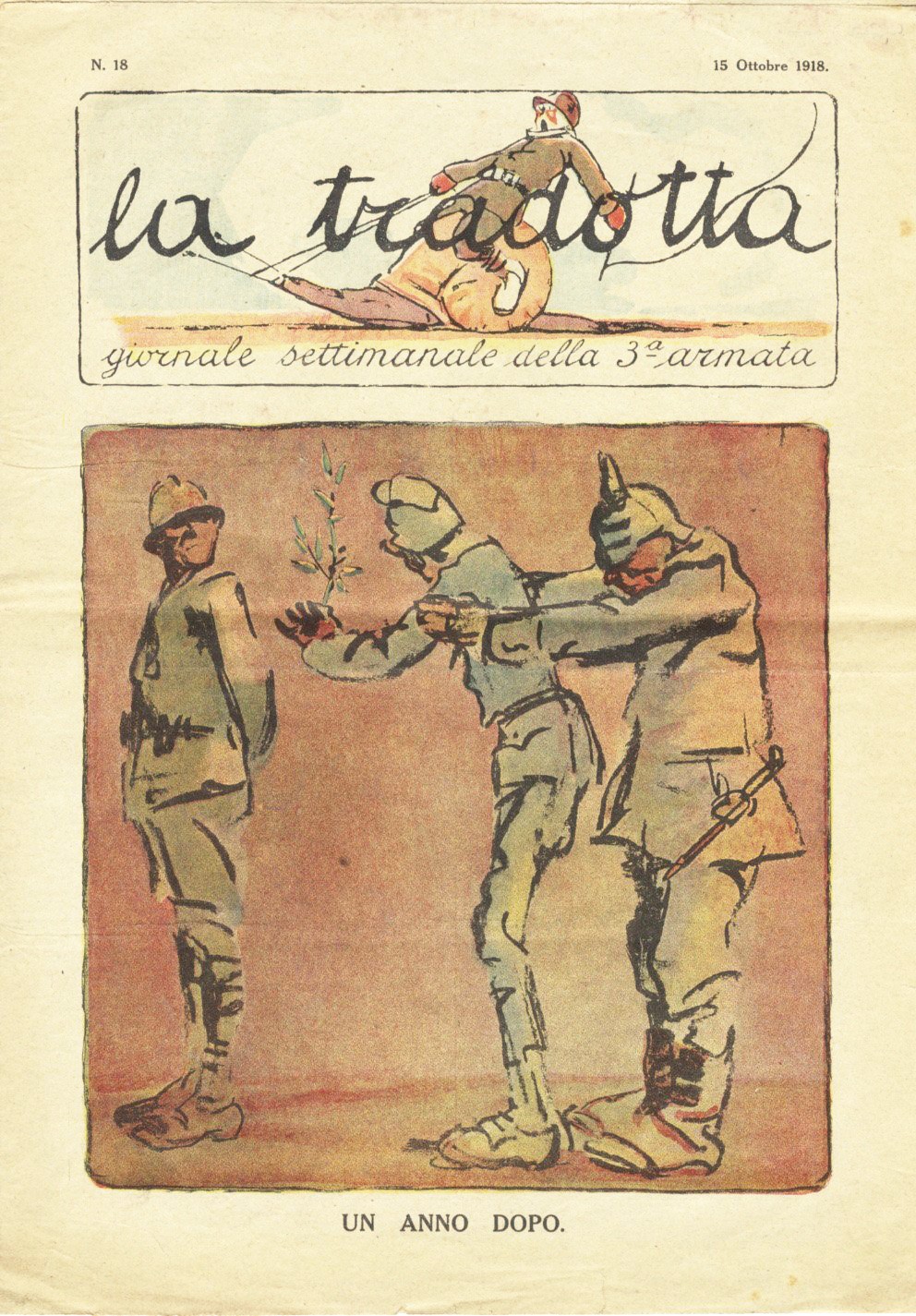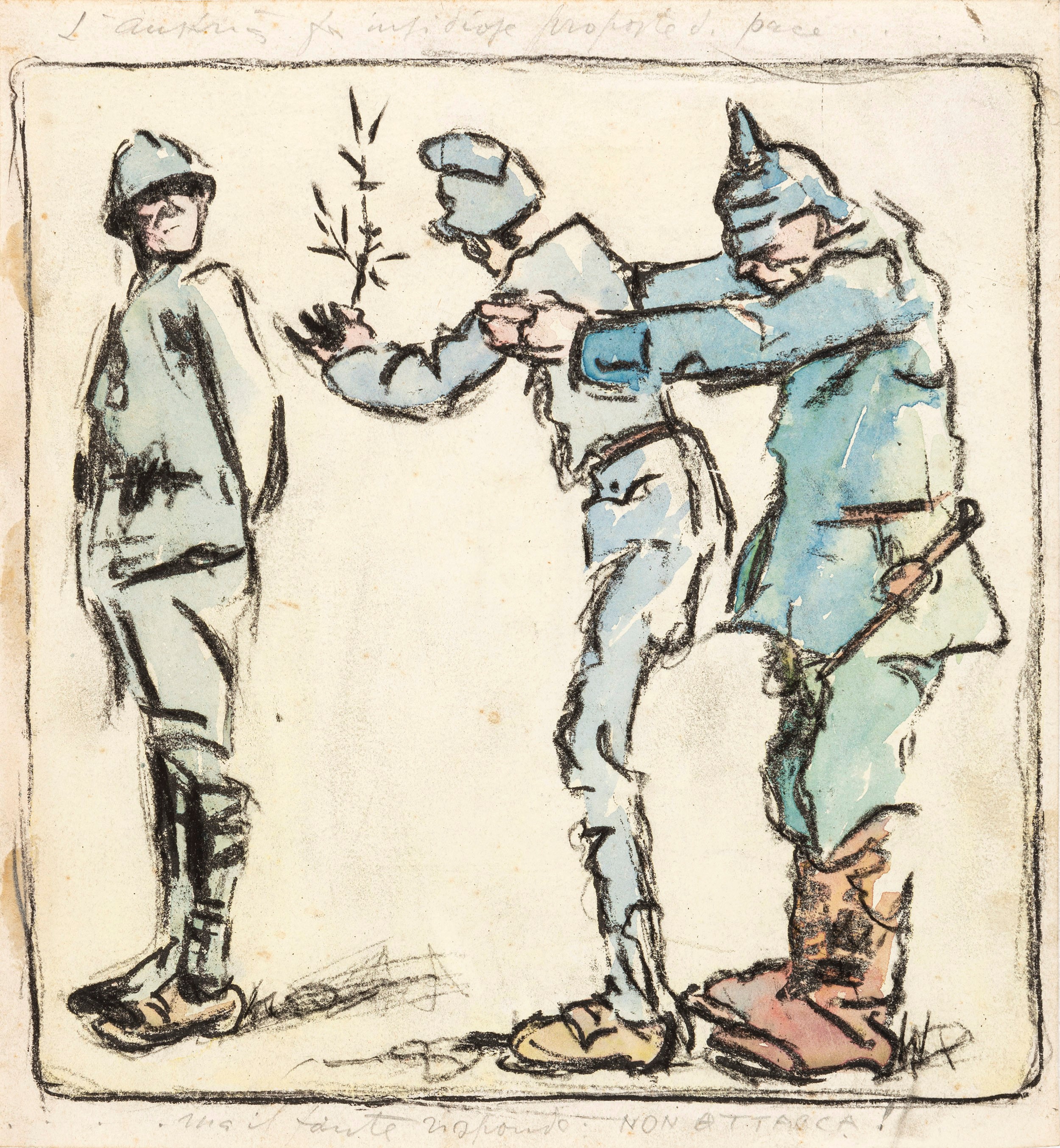 carboncino e acquerello su cartoncino, 23 x 24,5 cm 1918 Preliminare di copertina realizzato da Sacchetti per La Tradotta n. 18 del 15 Ottobre 1918. Sacchetti fece parte di quella schiera di illustratori combattenti che presero parte alla realizzazione del Giornale della Terza Armata durante gli anni della Prima Guerra Mondiale, realizzando pagine ricchissime di personaggi e di situazioni tra l’esilarante e il grottesco che servivano a ringalluzzire le nostre truppe. « L'austriaco fa insidiose proposte di pace...ma il fante risponde: NON ATTACCA! » Firmato.