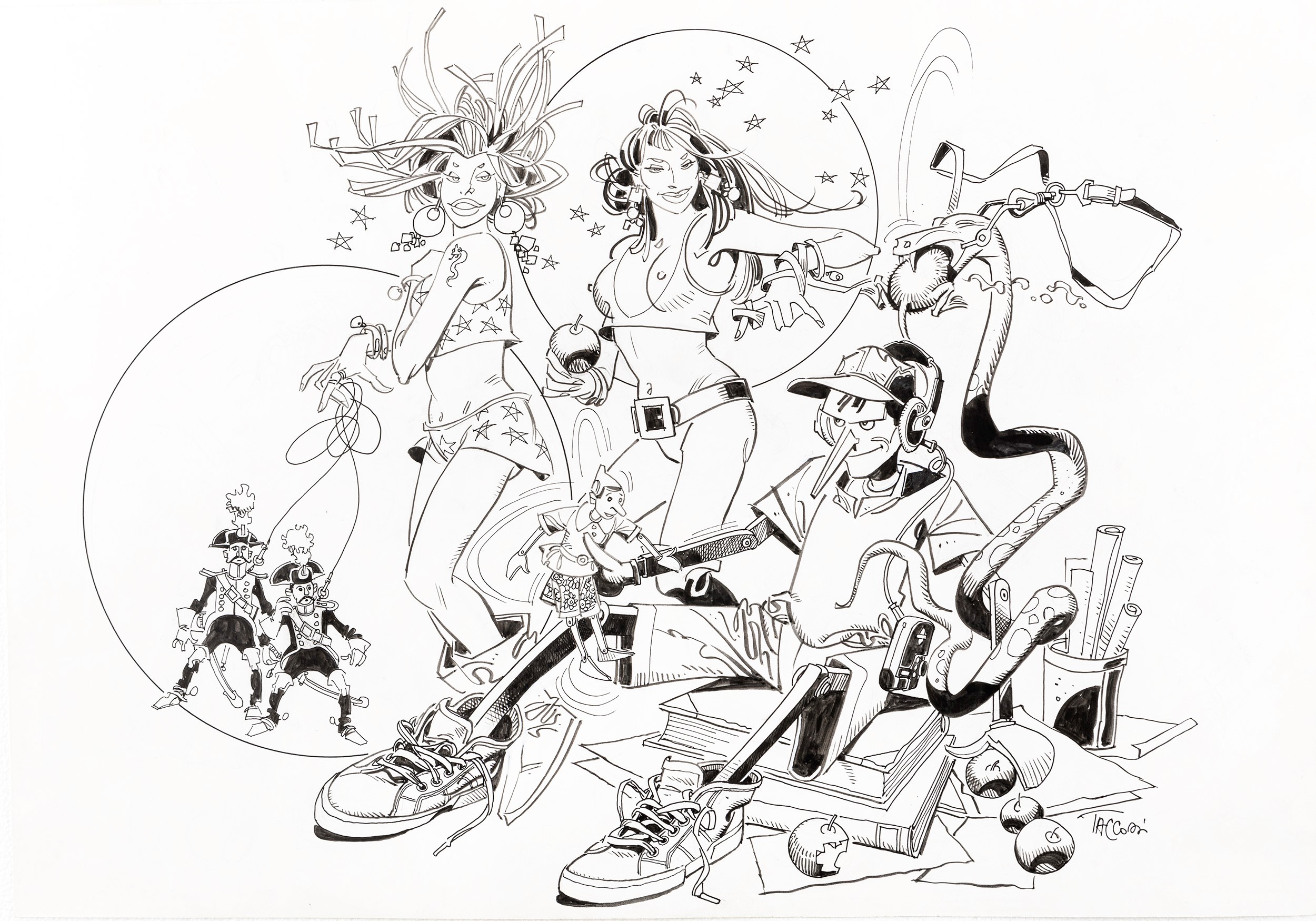 matita e china su cartoncino, 50 x 35 cm 1998 Illustrazione originale realizzata da Tacconi in occasione della mostra Pinocchio: un naso lungo...il giro del mondo, tenutasi a Bassano del Grappa nel 1998, pubblicata sull´omonimo catalogo a pag. 130 da Arsenale Editrice. Firmata.