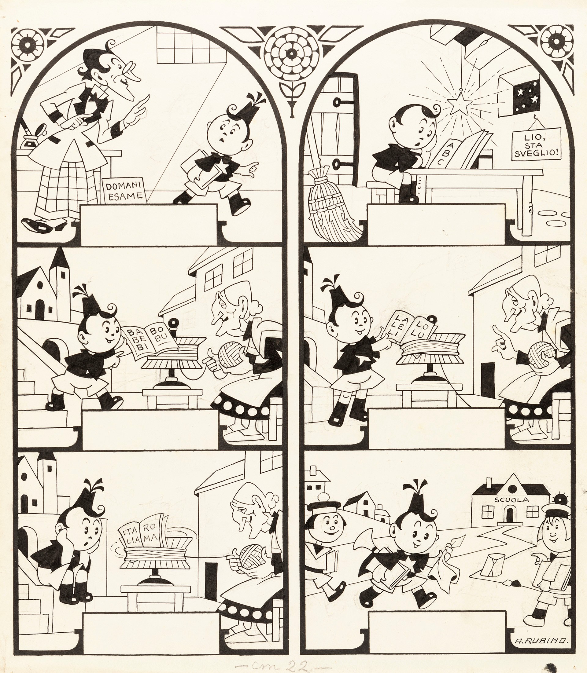 matita e china su cartoncino, 35 x 40 cm 1927 Tavola originale realizzata da Rubino per un episodio del suo Lio Balilla, pubblicata sulla prima pagina del giornale Il Balilla nel 1927. Dopo diciannove anni al CdP, vero e proprio punto di riferimento nella redazione del giornale, Rubino decise di abba
