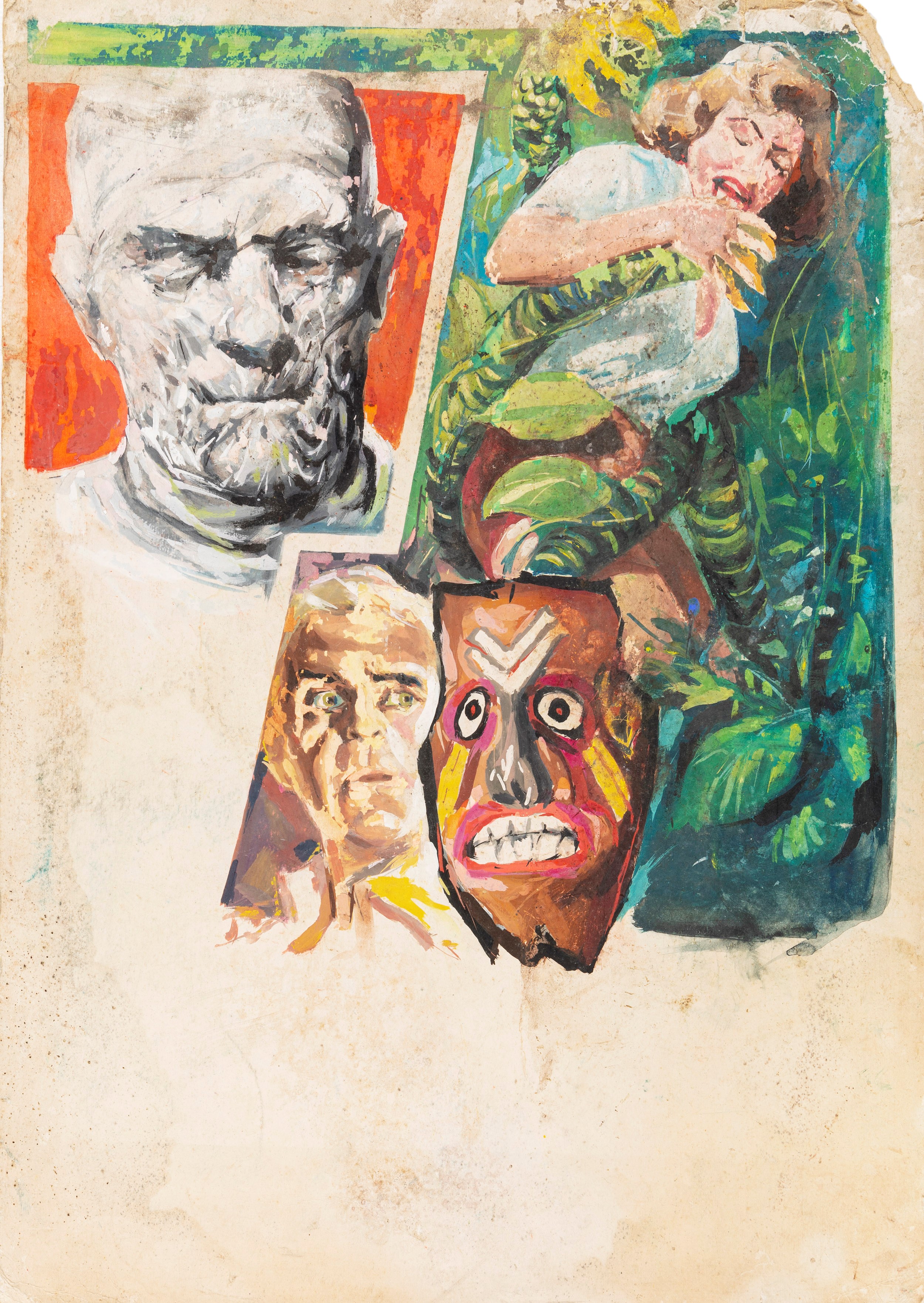 tempera su cartoncino, 35 x 50 cm 1957 Bozzetto preliminare realizzato da Ciriello per la locandina ufficiale del film L'isola stregata degli zombies, diretto da Reginald Le Borg con Boris Karloff, Murvyn Vye e Adam West nel 1957. Diffuse tracce di umidità, pieghe ai margini e mancanze con strappi all'angolo superiore destro.
