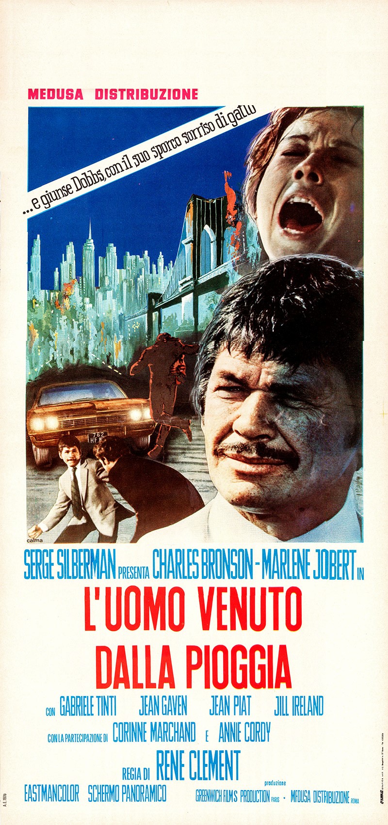 tempera e collage fotografico su cartone, 33 x 43,5 cm 1970 Bozzetto originale realizzato da Calma per la locandina ufficiale del film L'uomo venuto dalla pioggia, diretto da René Clément con Charles Bronson, Marlène Jobert e Gabriele Tinti nel 1970. Lievi pieghe agli angoli. Firmato.