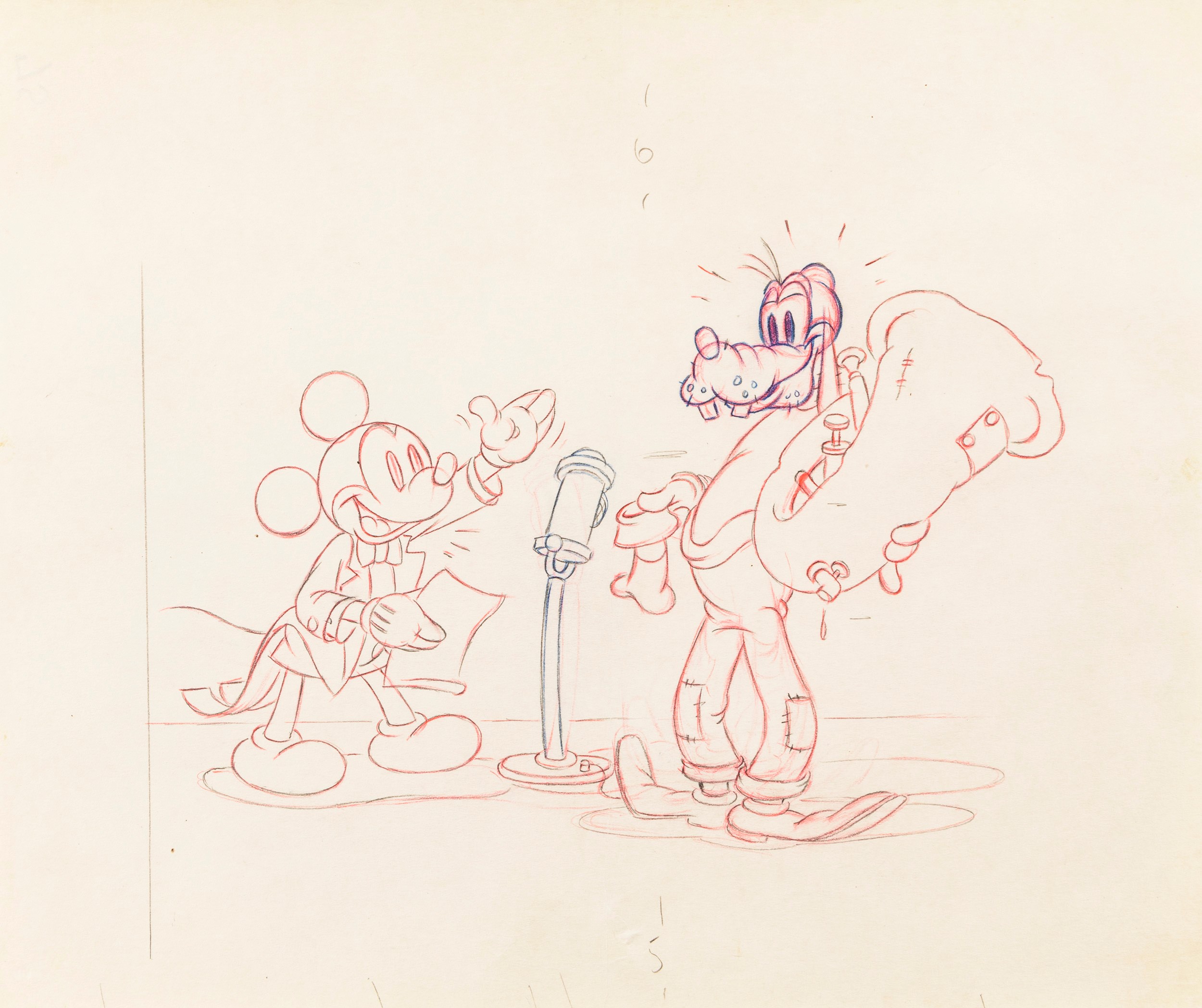 matita e pastelli su cartoncino, 30 x 25,5 cm 1937 Disegno preliminare realizzato da Wood per un‘illustrazione promozionale del cortometraggio Mickey‘s Amateurs, pubblicata sulla rivista Good Housekeeping a pag. 37 nel Febbraio 1937. Piccola piega al margine inferiore.