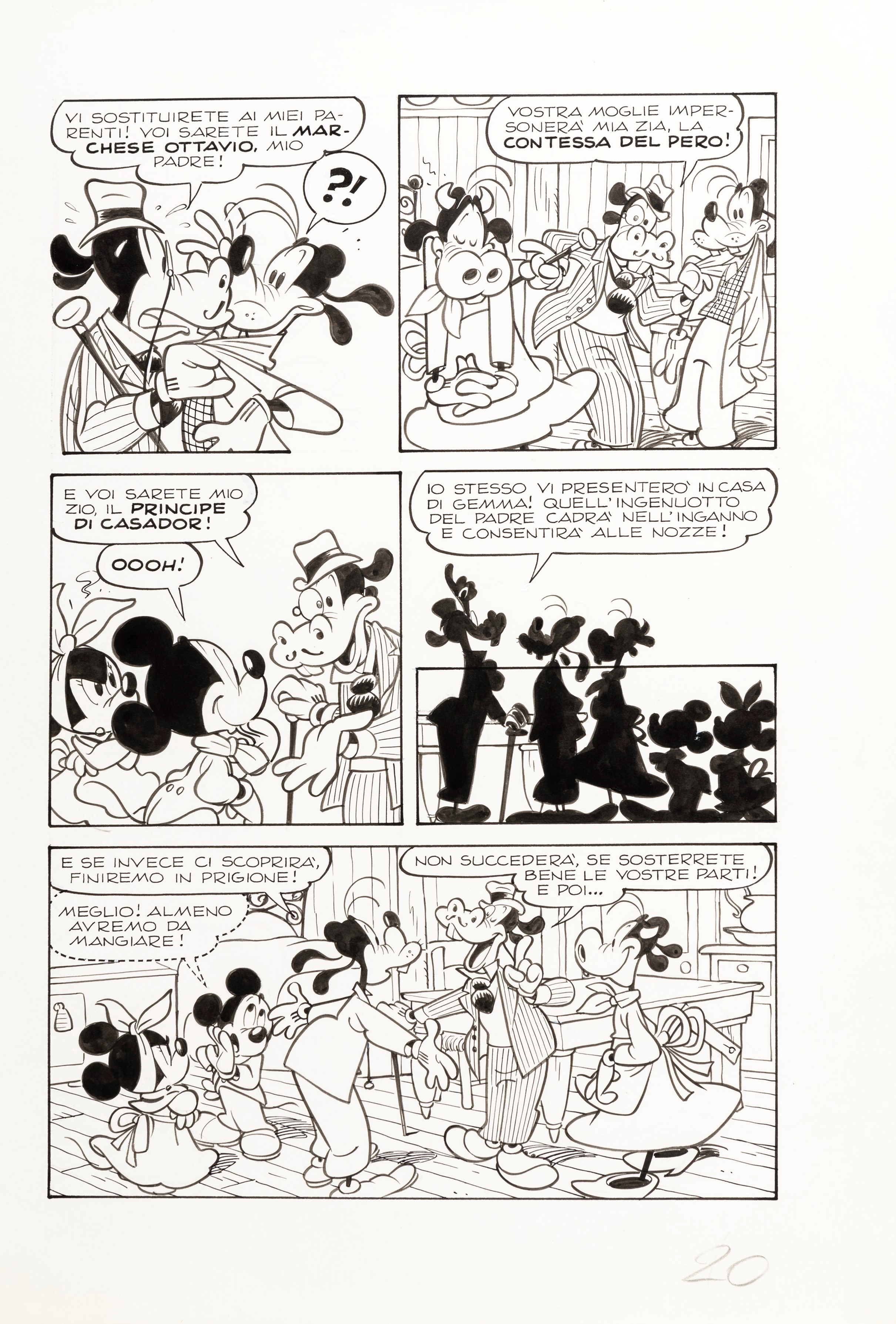 matita e china su cartoncino, 25,5 x 36,5 cm 1993 Tavola originale realizzata da Cavazzano per Il Teatro Alambrah presenta: Miseria e nobiltà di Eduardo Scarpetta, edita su Topolino n. 1955 a pag. 20 nel Maggio 1993. Una storia già entrata nella leggenda come una delle migliori parodie Disney di sempre, sui testi di Francesco Artibani e dall‘attore Lello Arena.